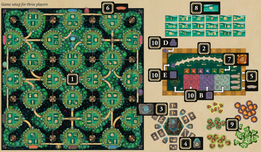 注:フレームを組み立ててボードを敷設するときは、24の祠のそれぞれに、プレイヤーの数に必要な数のアクションフィールド(=小さな正方形)があることを確認してください。