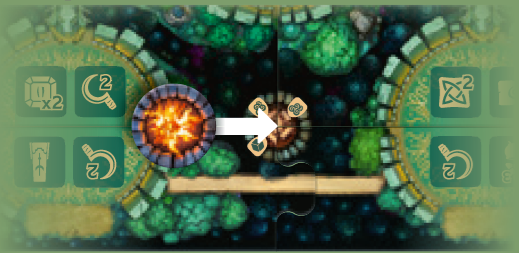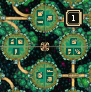 ドルイドマスターの右隣にいるプレイヤーから反時計回りの順番で、各プレイヤーは4つのフレームの接続部分にある4つの祠のうちの1つの空きスペースに自分のコマを置きます(2ページの「ゲームセットアップ」の図を参照)。 |