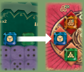 祠に到着したときにもそれ以降にも、誰も1つの祠で複数のアクションを実行することはできません。したがって、このルールは常に適用されます:祠ごとに色ごとに最大1つのダイス。