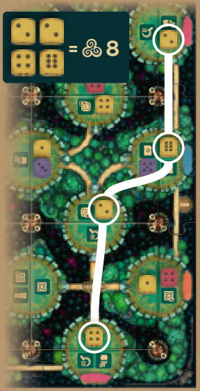 使用したダイスごとに2名声ポイントを受け取ります(さらに、1番目、2番目、または3番目のリンクの場合は8、6、または4名声 ポイントが加わります)。