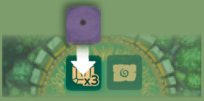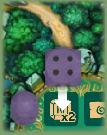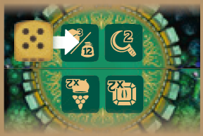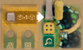 次に、コマが立っている祠の空きアクションフィールド(正方形)の1つを選択し、その上に個人サプライからダイスを1つ置きます。この時点で、共通サプライに食料を返すことによってこのコストを支払わなければなりません。ダイスを配置するために、その目と同じ数の食料がかかります。 |