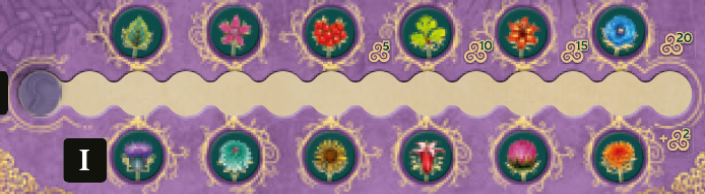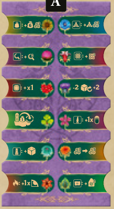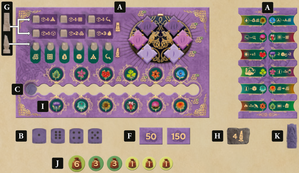 I) 12 種類のハーブ – これらを裏向きにシャッフルし、大きなプレイヤー パネルの下部にある 12 の対応するフィールドに表向きに置きます。