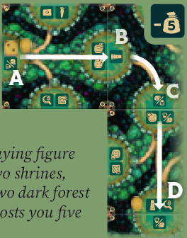 例:2つの祠を経由してAからDに移動し、2つの暗い森のエリアを通過します。この移動には5つの食料が必要です。 |