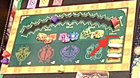 【ゲーム終了時】には→各祠の🎲目を比べて最大数の目のみがマジョリティ得点を獲得するので、大きな目を置きたいが🎲目分の食料💰を支払う必要があるので 食料の入手もとても大事