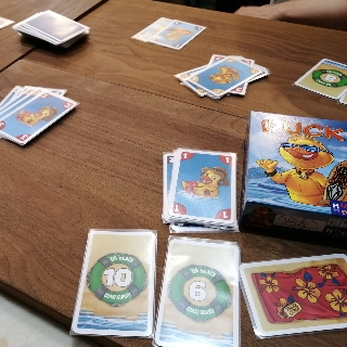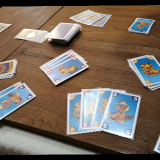 一気にカードを出そうとカードを溜めていたら、ダック宣言をされてグワァグワァってアワアワしちゃいドボンしたり、1ラウンド目と5ラウンド目は手札を出し切りラウンドボーナスを獲得したけど、それ以外がダメダメやったりやら。カードの捨て方も気をつけないと欲しいカードを補充されたりしちゃうしで、なかなか考えます。