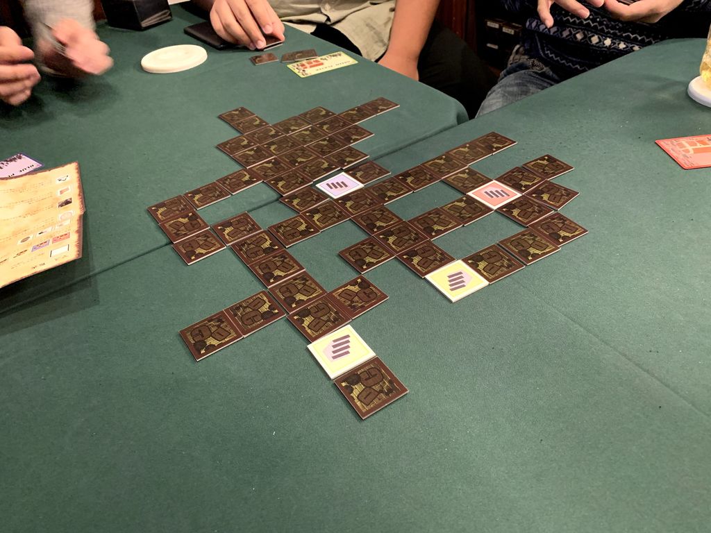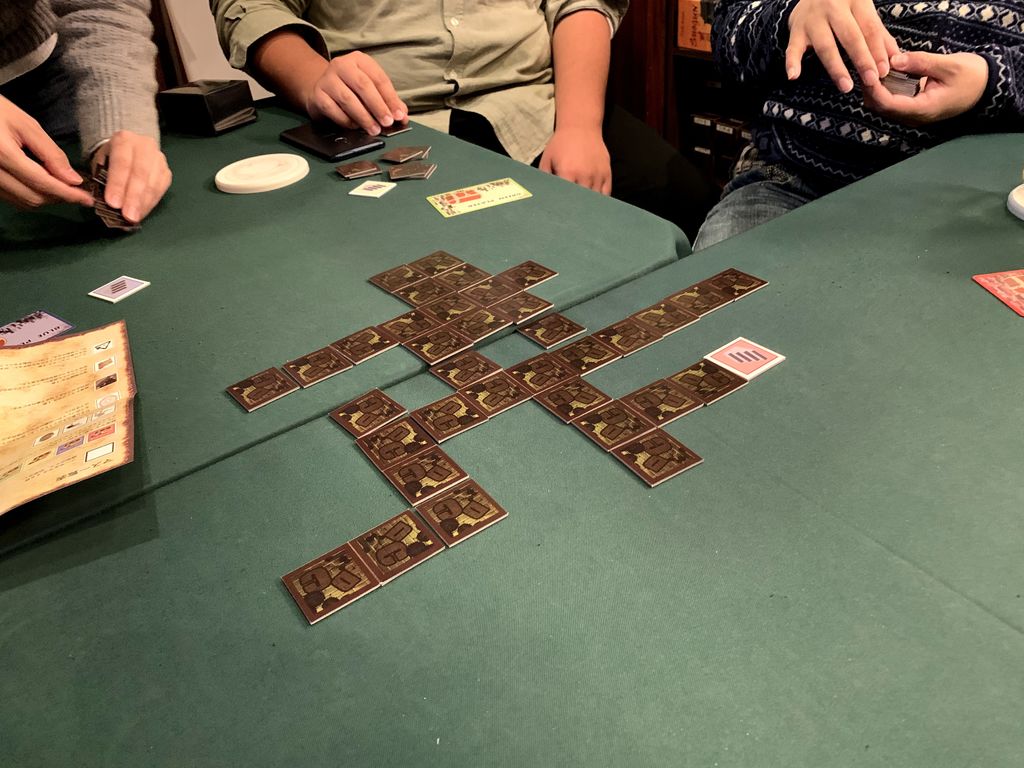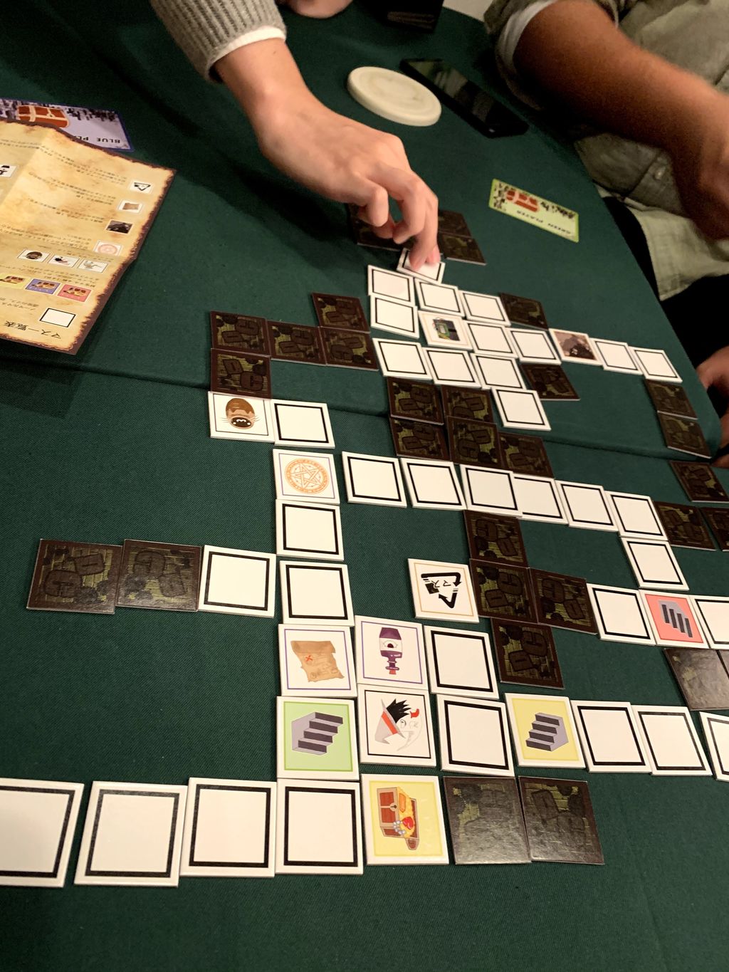 最初のプレイヤーは任意の場所にマスを裏向きで置いてください。その後は最初に決めた順番でマスを1枚ずつ裏向きで置いていきます。ただし、マスは既に置かれているマスと隣り合った場所にしか置けません。スタートマスのみ表向きで置きます。どのマスも置くタイミングは自由です。