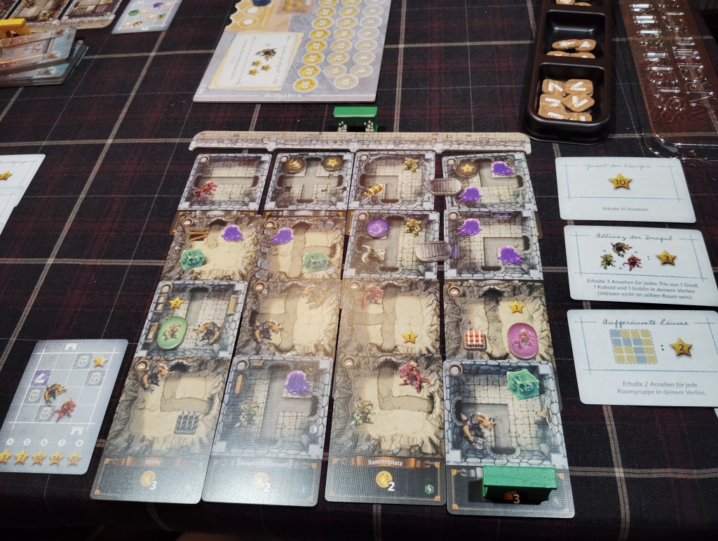 ダンジョンつくりの方針としては、個人目標カードの達成ボーナス得点は大事なので達成は目指しつつ、1〜3ラウンド終了時に獲得できる目標カードの達成得点も大事になります。