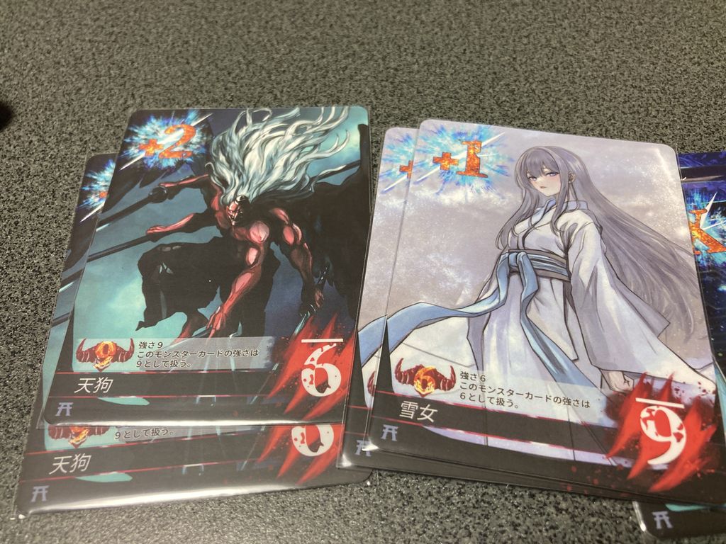追加モンスターは天狗の雪女の2種です、討伐によりキャラクター攻撃力がアップする仕掛け。この辺がバランス的にどうなのか。ちなみにカードの左下に拡張のマークが印てあるため、基本セットと混ぜてもあとで仕分けしやすくなってます。