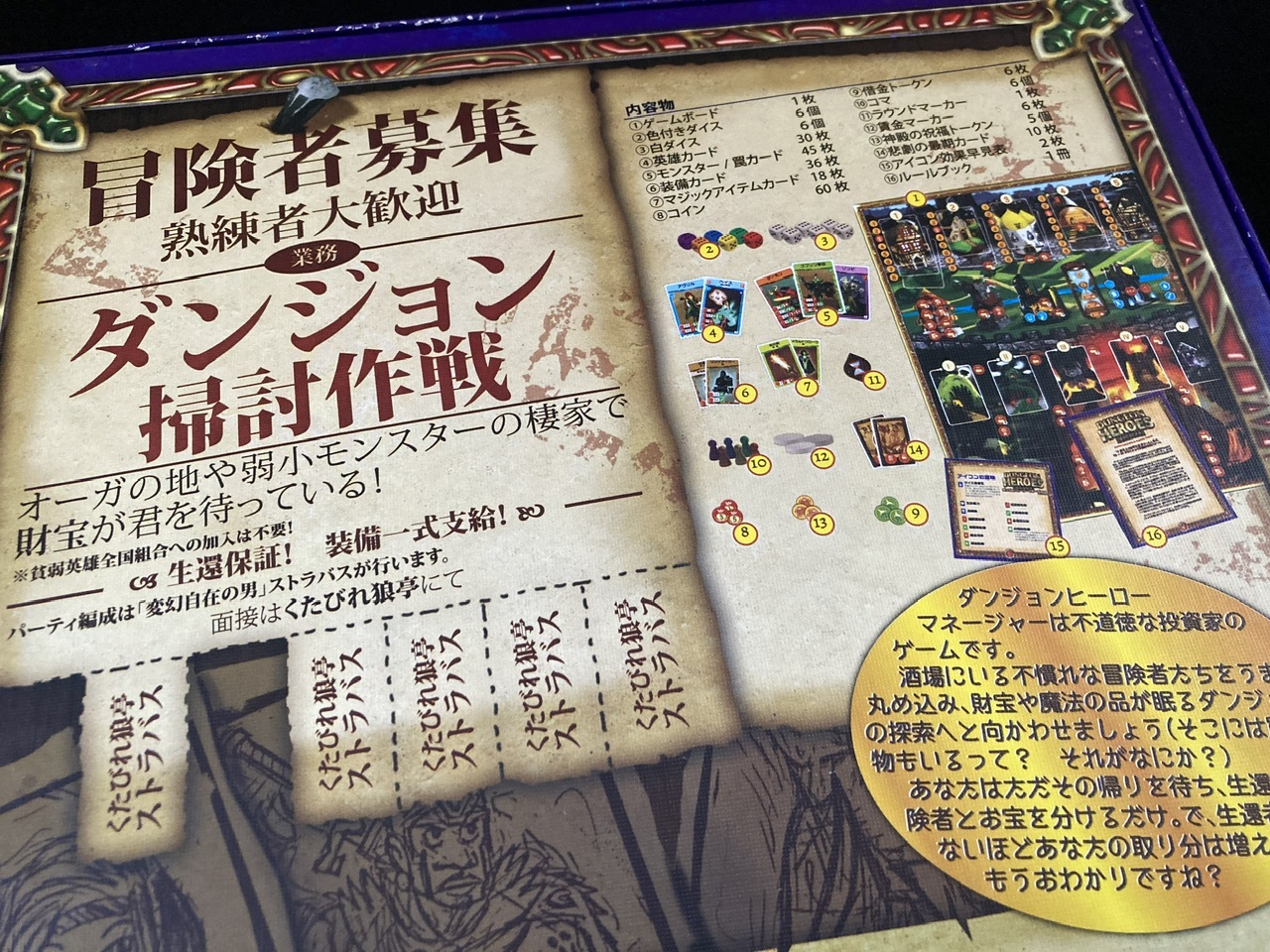 冒険者カードは酒場にランダムに配置するのですが、裏面が熟練者モードなのでシャッフルしても丸見えなのです。対策として我々は大きな封筒に全部入れてランダムに引く、という方法をとりました。これおススメです。