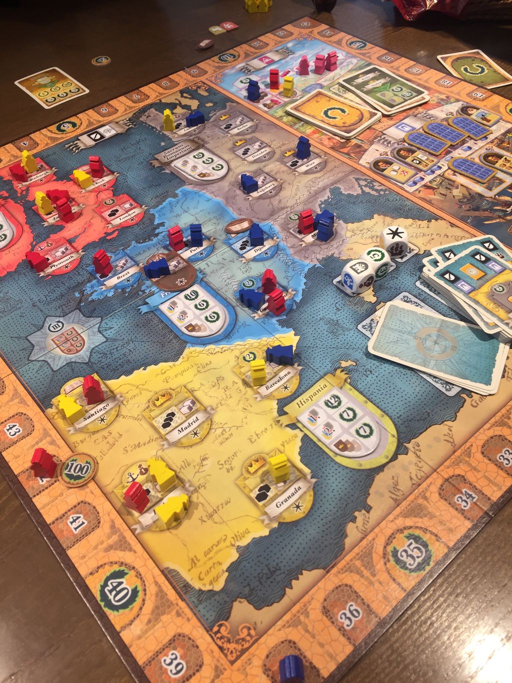 下家上家と2人続けて2つの船にワーカーを送り込む特殊アクションで、がっつり資源を持っていかれる辛い展開…。青アクションでアクションカードを増やしつつ、自分で同じ船に2つ置いたりして無理やり資源を確保して、なんとか赤エリアに貴族を送り込んでいく。とにかく手数でカバーするしかない、という感じ。