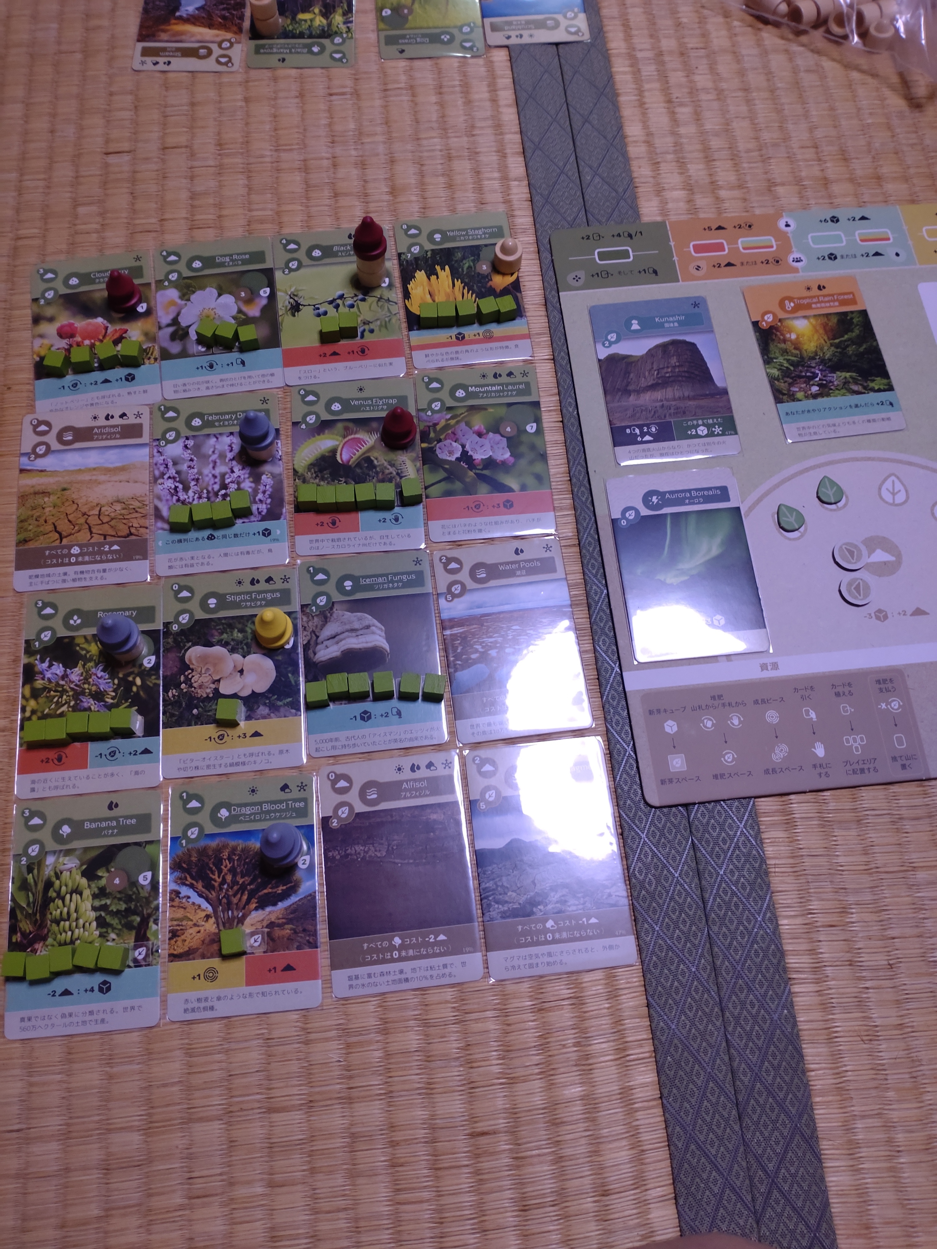 植物カードや地形カードを4☓4の16枚を配置して、勝利点を競うゲームです。