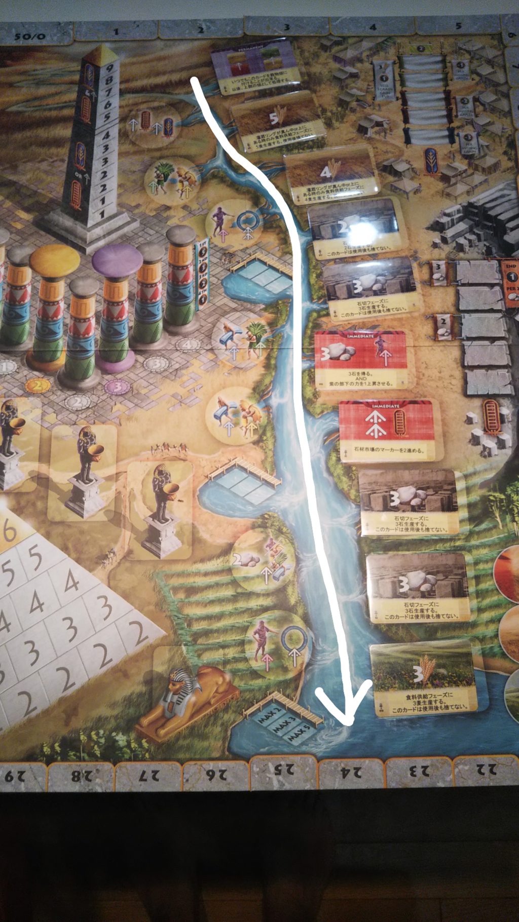 エジツィアもその部分は踏襲しつつも、他ゲームに比べ、「あいつ次、絶対、あのアクション打つわ❗️」の見通しが非常に良く、「あ~ぁ、取られちゃった…」じゃなくて、「これ取ったら、次の手番までにあそこは消えてるな。これやってる場合じゃねぇ❗️」の思考になる。