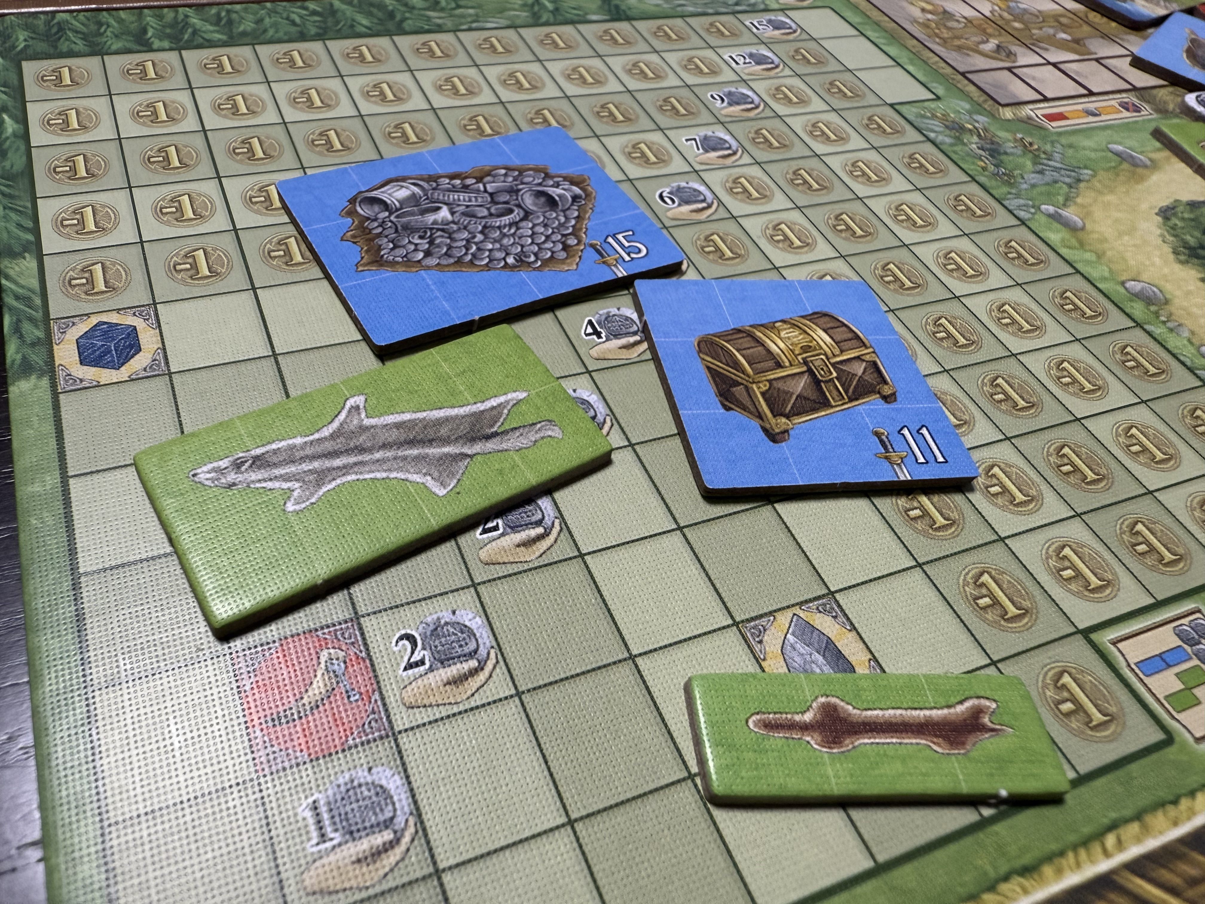 その点、オーディンは「充実」と言う概念がボード上に「面積」として可視化されています。タイルに描かれた物品は見ているだけでわくわくする類のものですが、それが隙間なくびっしりと自分の陣地に敷き詰められている光景はとても愉快です。何故かと言うに、それは「可視化された豊かさ」だからです。
