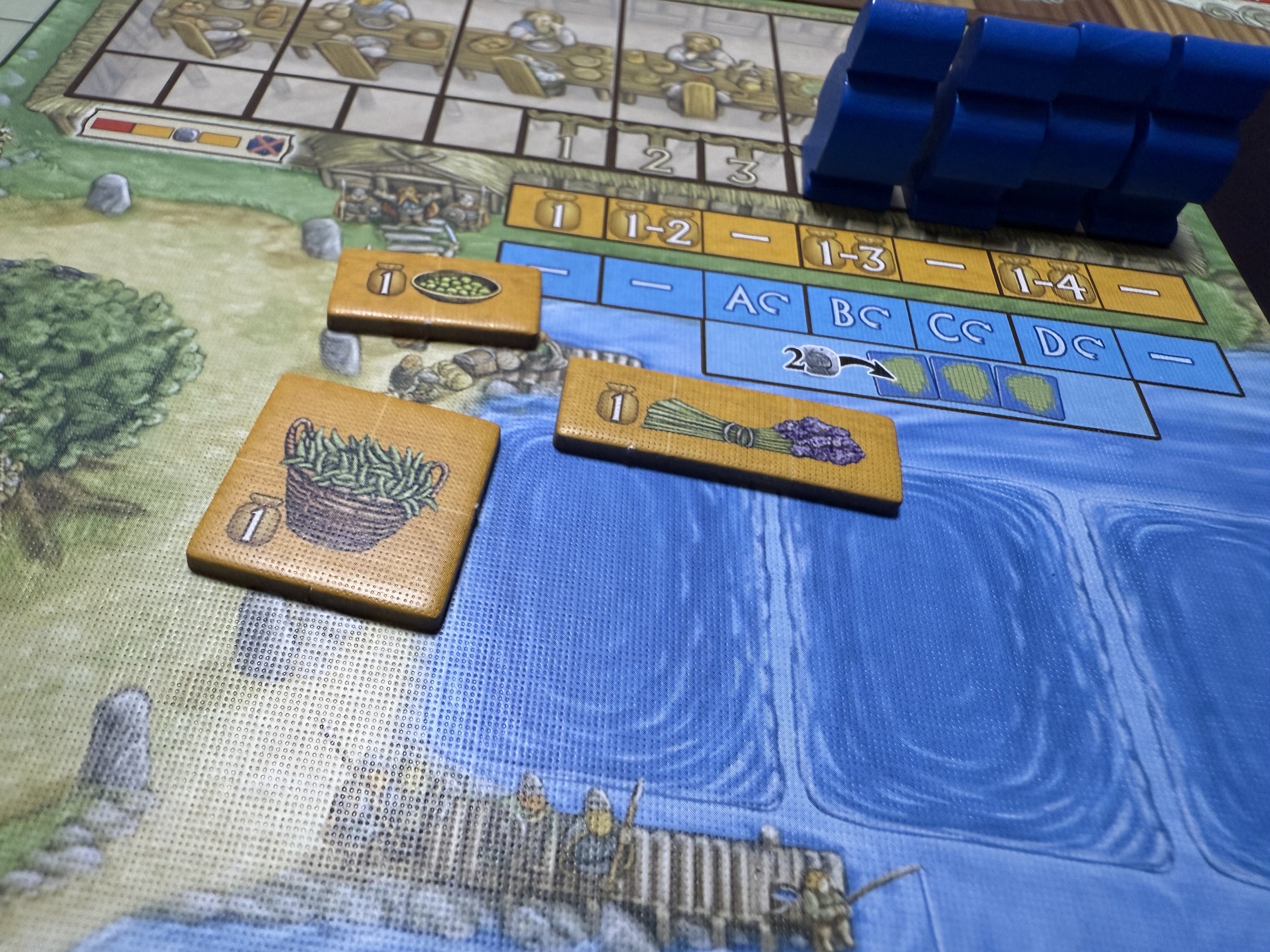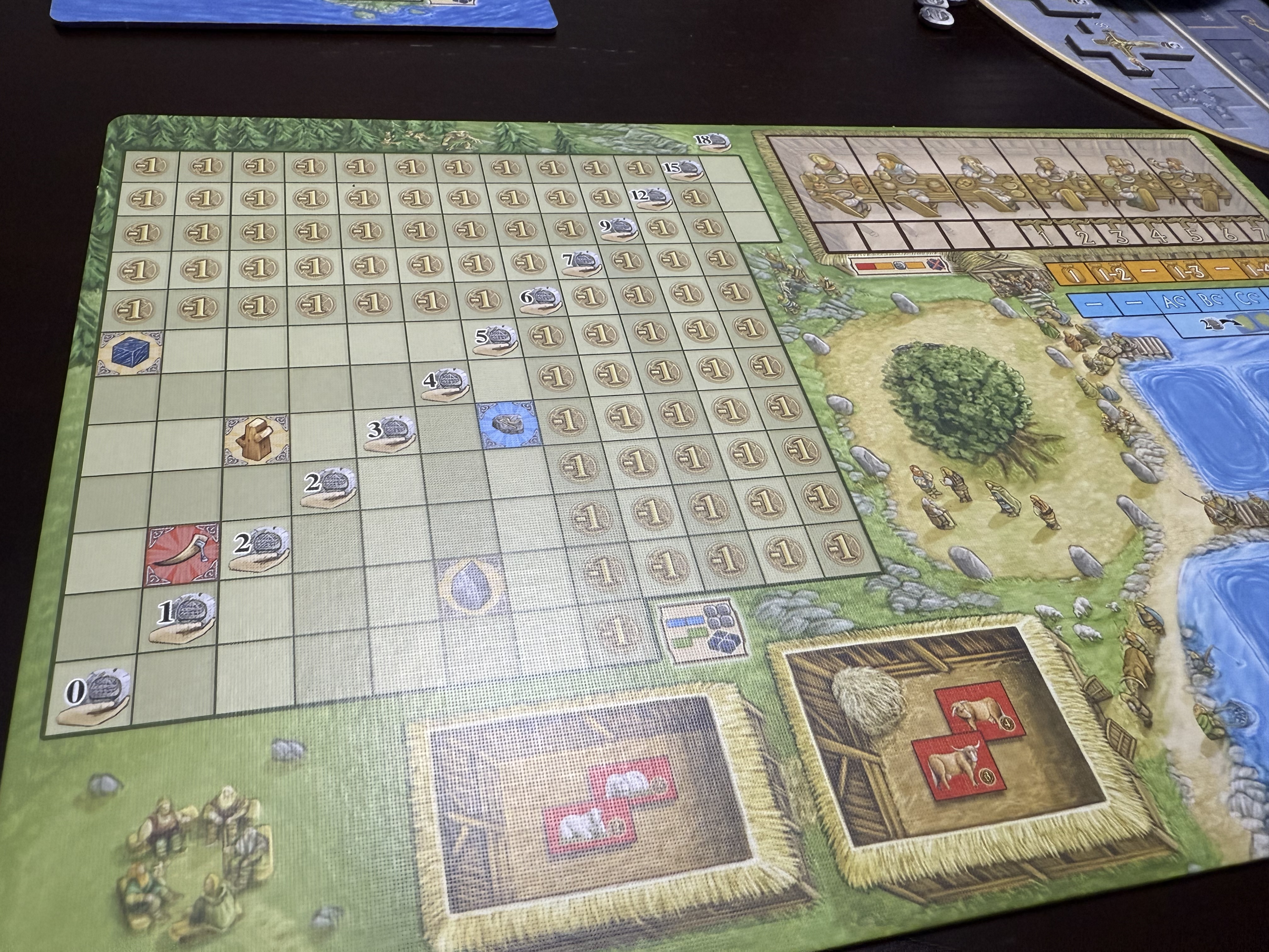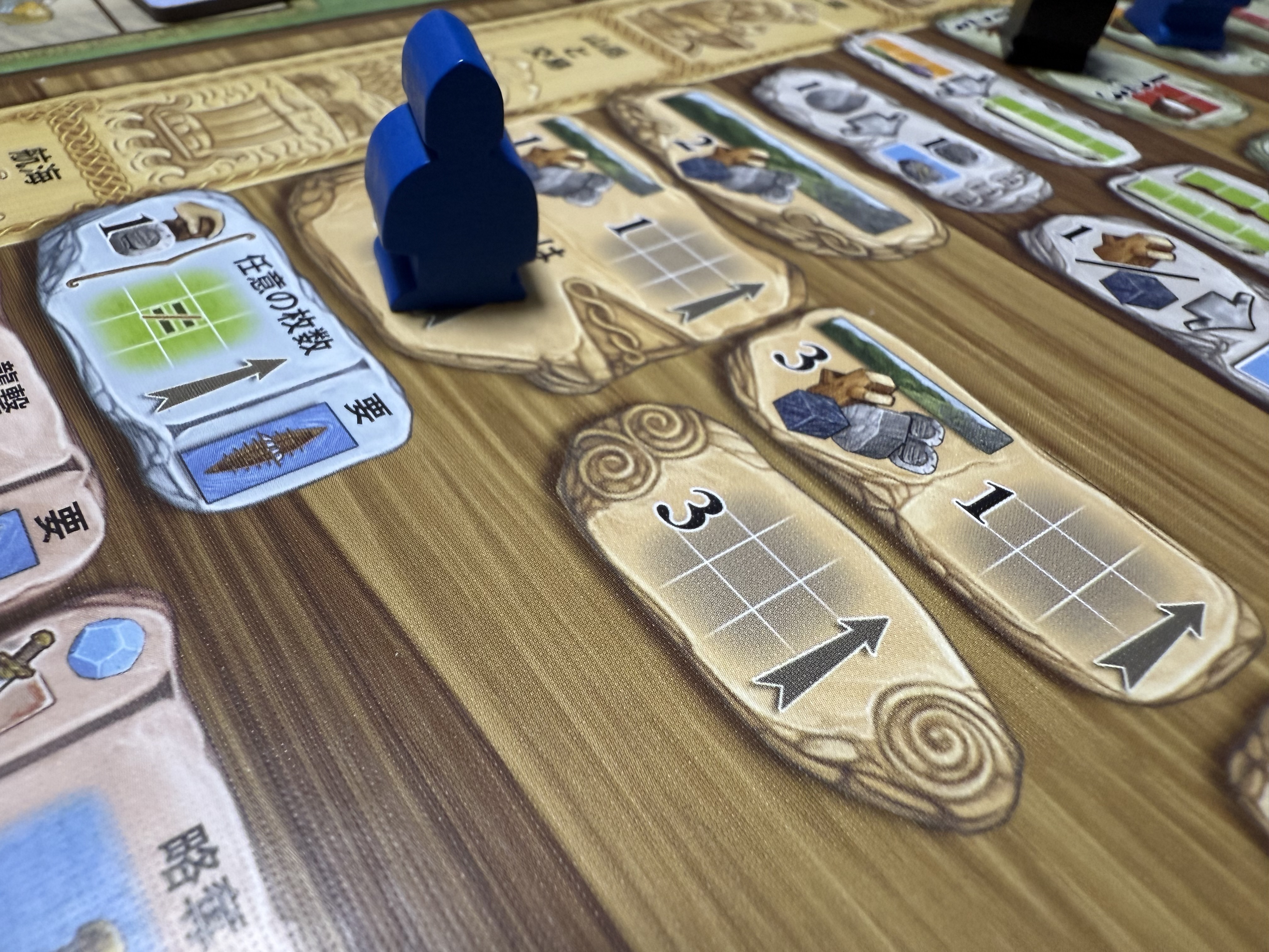 序盤から取得可能な木材と、中盤からしか取得できない石材の間には漠然と「木材>石材」みたいな序列をやんわりと感じさせます。なので「累積木材3と累積石材3だったら、石材をとっておいたほうがいいな、、」という判断ができます。もしくは「木材が9本もある。さすがに木材をとるべきかな、、」という局面もあるでしょう。実に悩ましいですね。自分の農場の発展スタイルと要相談って感じです。