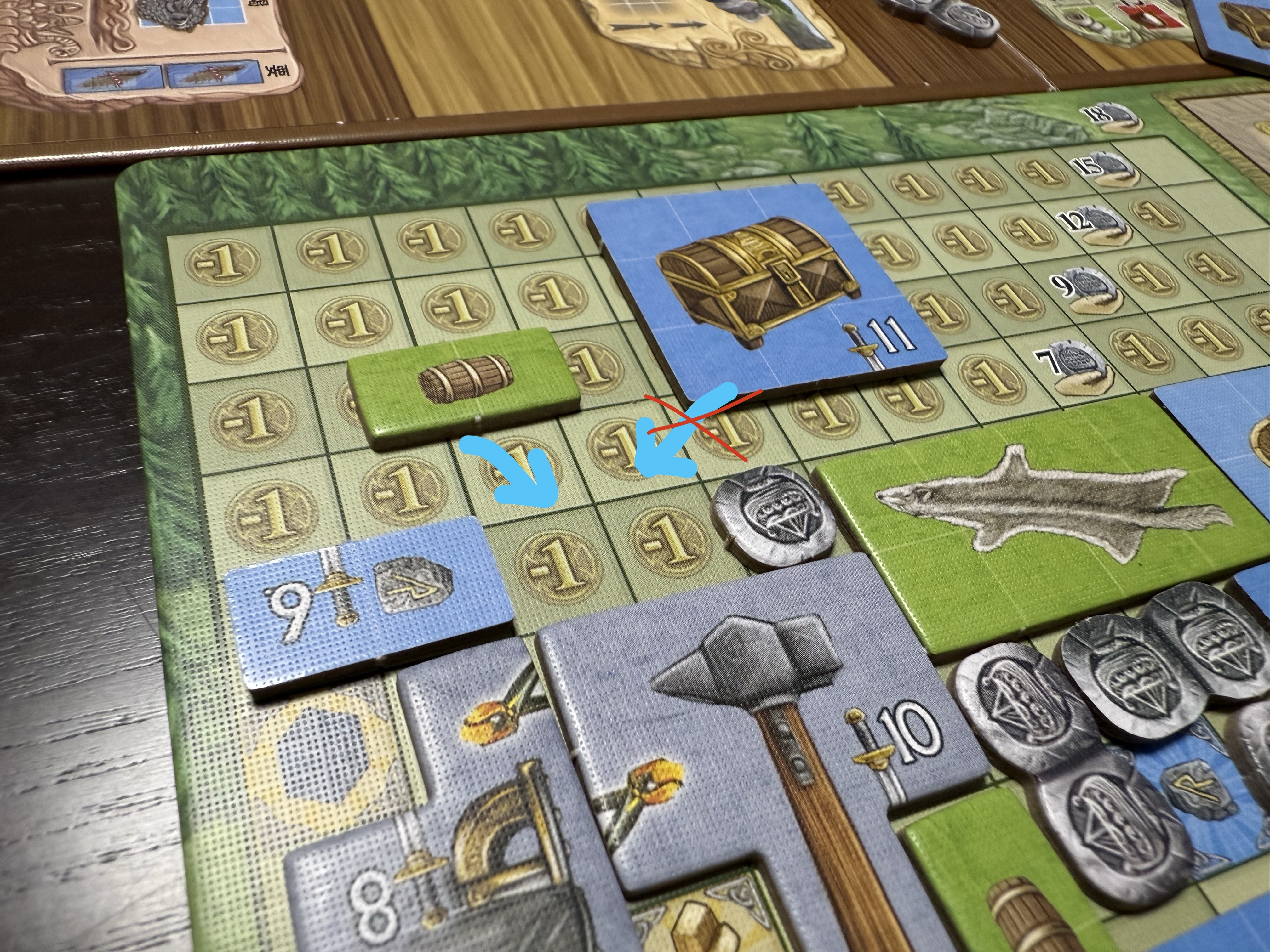 対するオーディンの祝祭には、資源そのものの有用性とは別の次元で「大小さまざまなタイルをできるだけみっちりと詰め込みたい」という思惑が存在します。(なぜなら収入を増やすためには隙間があってはならないというルールがあるからです。詳しくは後述します)