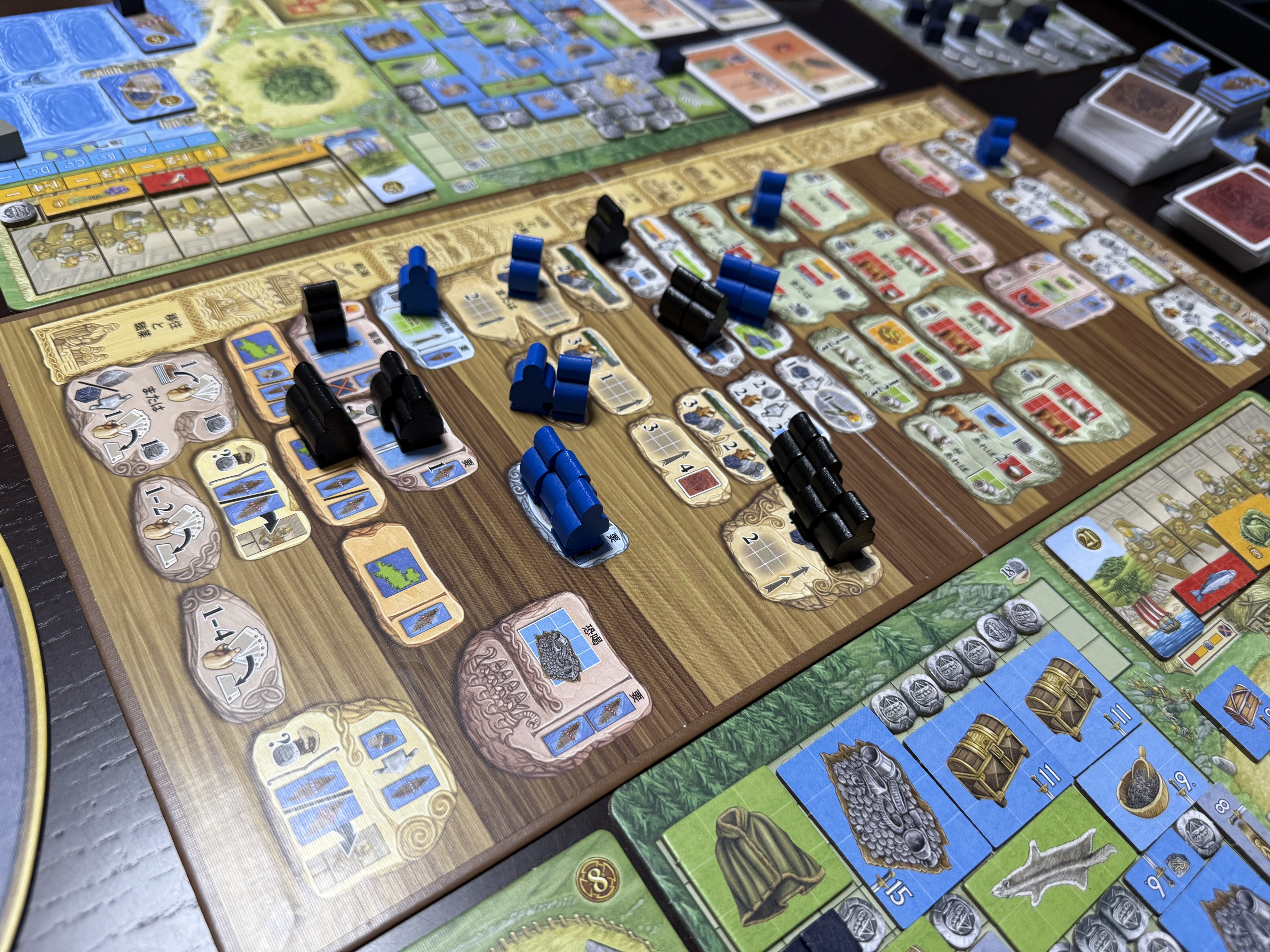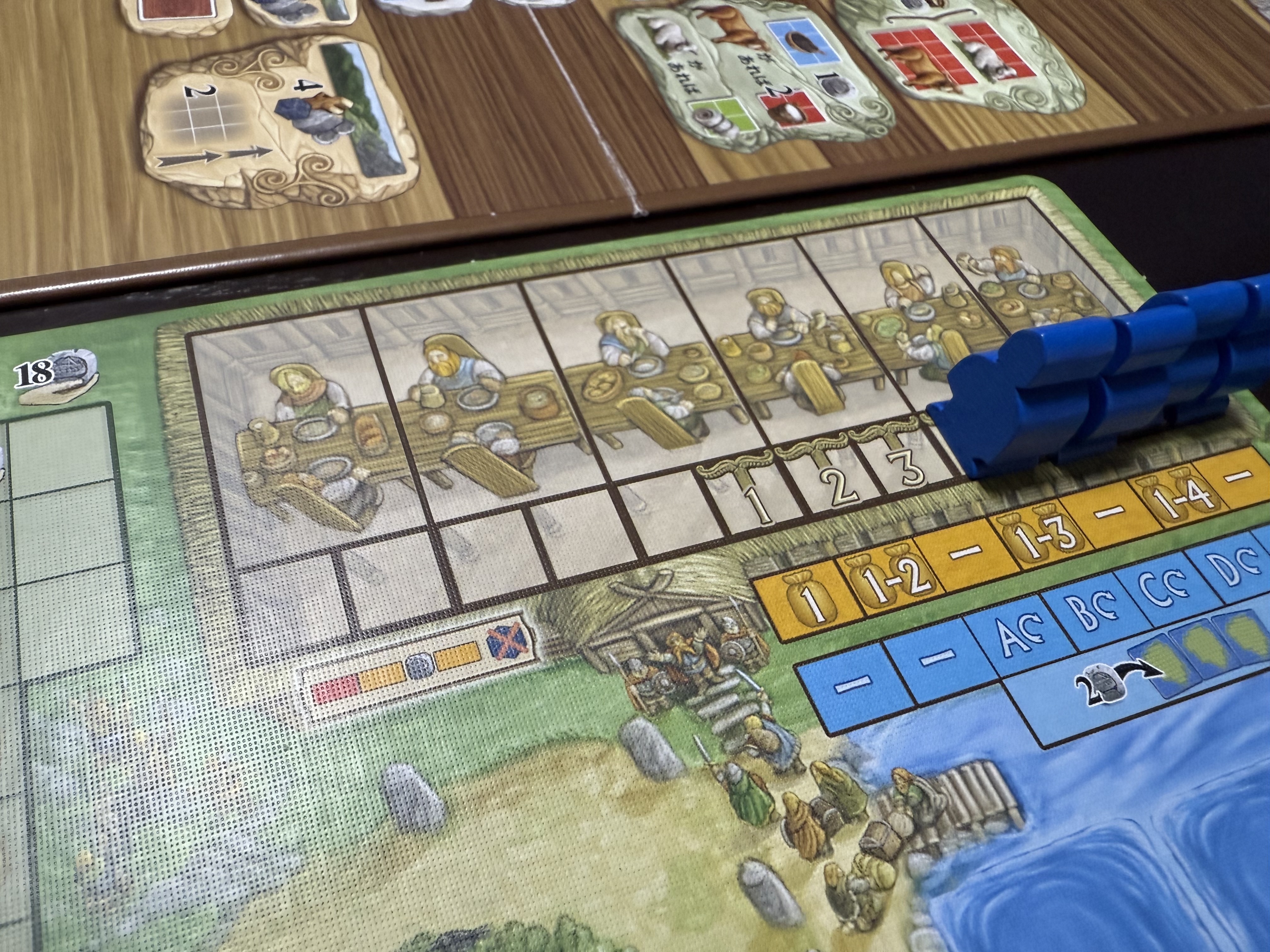 このように、様々な要素が緩やかに関連しあって=ミクロなパズルが連結してマクロなパズルの様相を呈しています。そんな中、プレイヤーは折り重なった思惑の内で自分の利益を最大化するべくアクションを選び決めていく訳ですが、詰まるところ「いかに個人ボードの隙間を埋めるか」と「いかに饗宴を執り行うか」というシンプルな目的に集約するため、はじめのうちは膨大なアクションの数に戸惑いこそあるものの、「なんべんやっても五里霧中」なんてことにはなりにくいです。そうなってくると、はじめのうちの戸惑いもむしろ魅力的な体験のように思います。