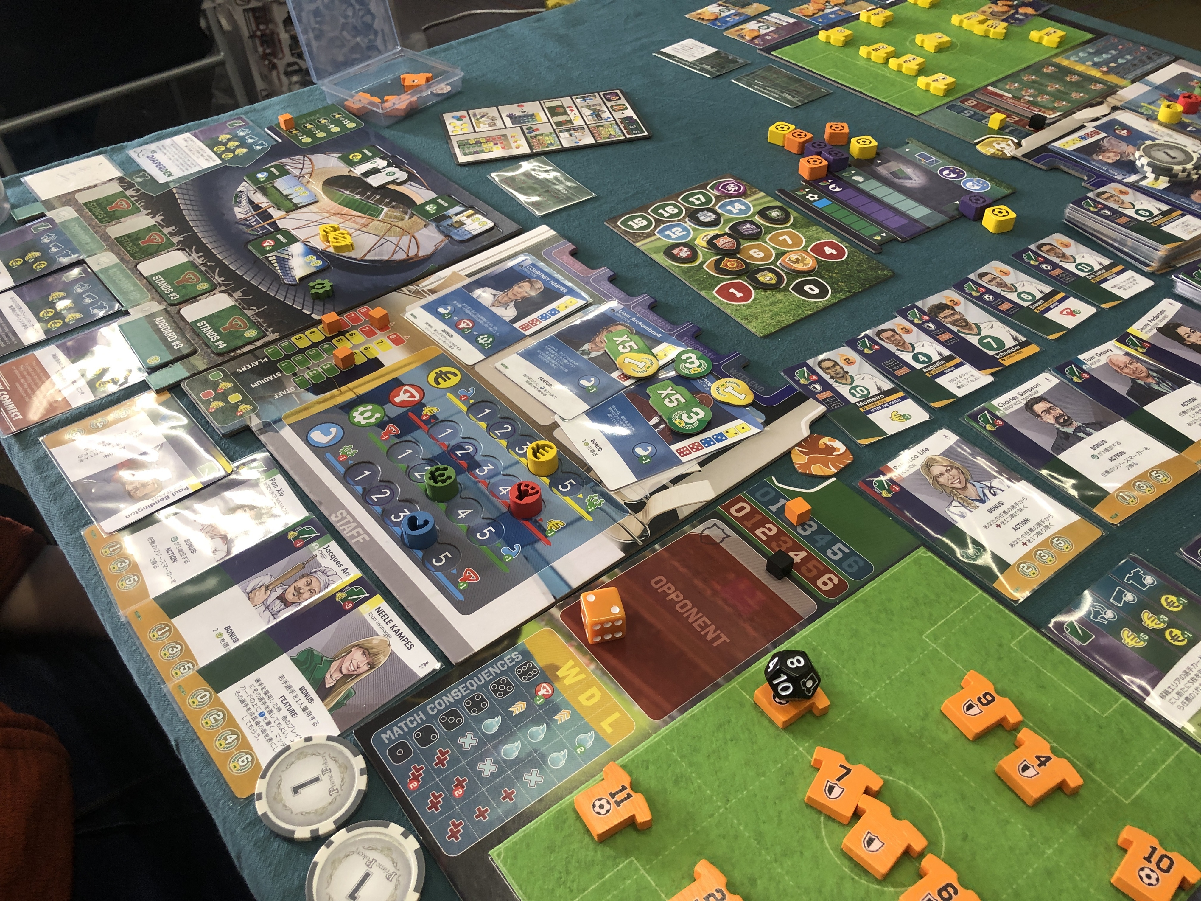 テーマ性が高く育てたチーム同士で対戦する辺りは道場訓ぽさがあり、従業員や設備の特殊能力で強化する辺りはプレタポルテっぽくもある。しかし実はリーグ戦の結果は勝利点のごく一部に過ぎず、スタッフのセットコレクション、目標カード、若手の育成、オフィスやスタジアムの拡張など勝利点を生み出す要素は多く、どこに重きを置くかで様々な戦略を試せるユーロゲームとなっている。この辺りが非常に面白く、私がこのゲームを気に入っている要因のひとつだ。