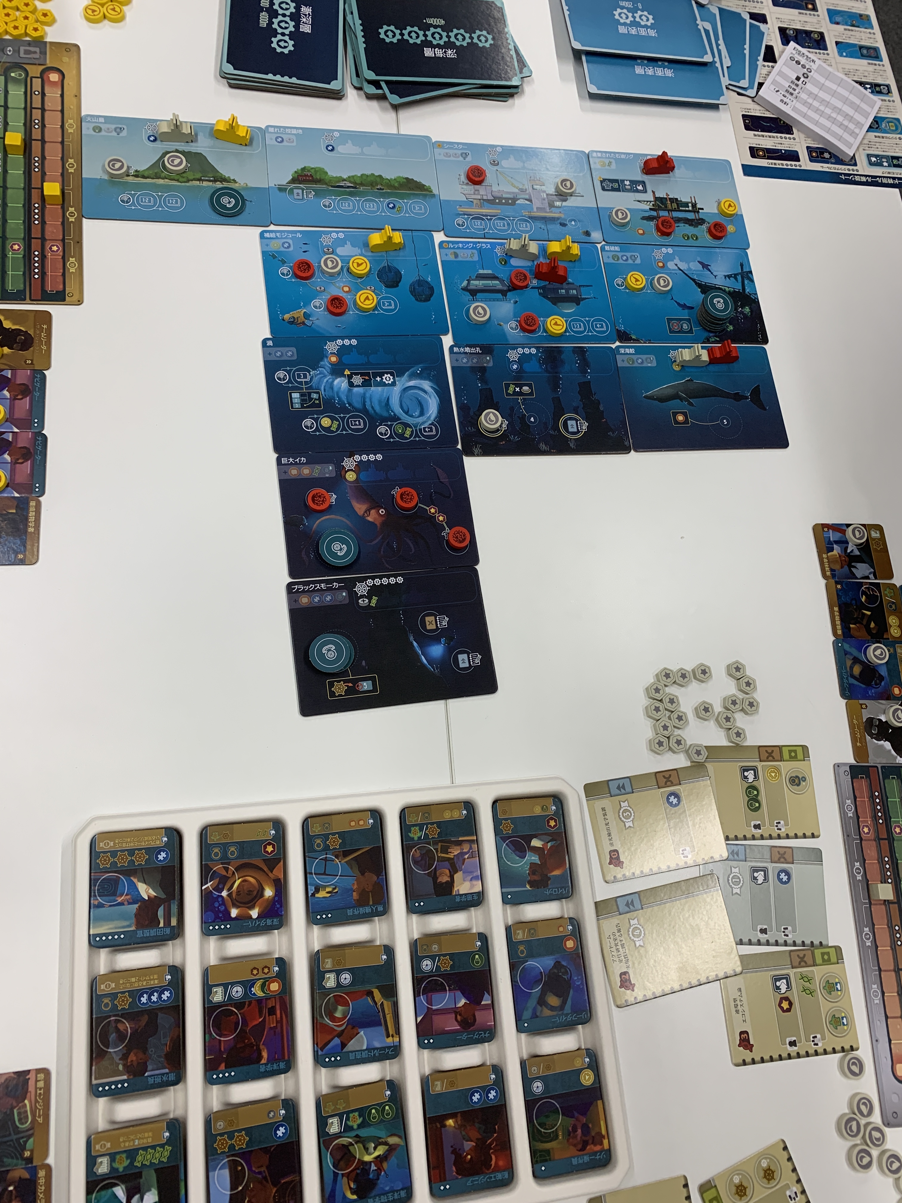 深海を探索していくテーマと、ボードをめくりながら新しい海域を広げていくメカニズムがぴったり噛み合っていて、最初の一手から心を掴まれました。自分が深く潜っていく感覚があり、アクションを選択するたびに息が詰まるような緊張感とワクワクが入り混じります。コンポーネントの質感や深海に行くほど深い青になる色合いもテーマを引き立てていて、没入感を強く後押ししてくれます。
