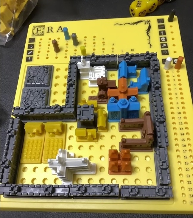 ふつうならタイルやカードで表現されるであろうことをフィギュアにしてプロックではめるという変わった作りになっているのが個人的にはこういうギミックが大好きで、見た目で町の発展がわかるのはワクワクします。