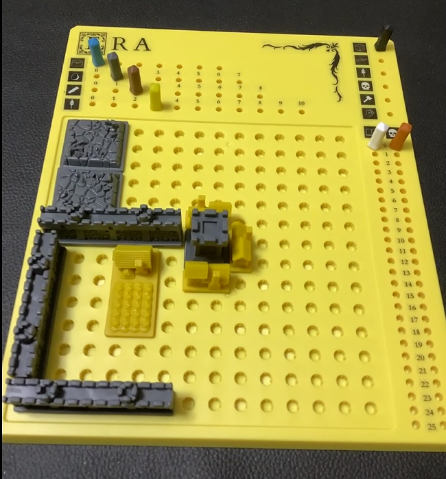 あと建物の個数は把握しずらいです。気が付くとあっというまに売り切れてたりします。個数を確認できるものがあったらとは思いますねぇ。あと右上にある黒いペグがラウンドの流れを示すものなのですが、1個ずつ刺して進めていくわけですが、これをいちいち刺して解決するのがめんどい気がします。プレイヤー間で解決するようにすればいいとは思います。