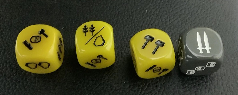 そして、このゲーム戦う要素もあります。灰色のダイスには剣や盾のダイス目があり、剣が少ないところから資源を略奪できたりします。しかし建設し終わった後の資源なので余っているものですから痛くないと思います。