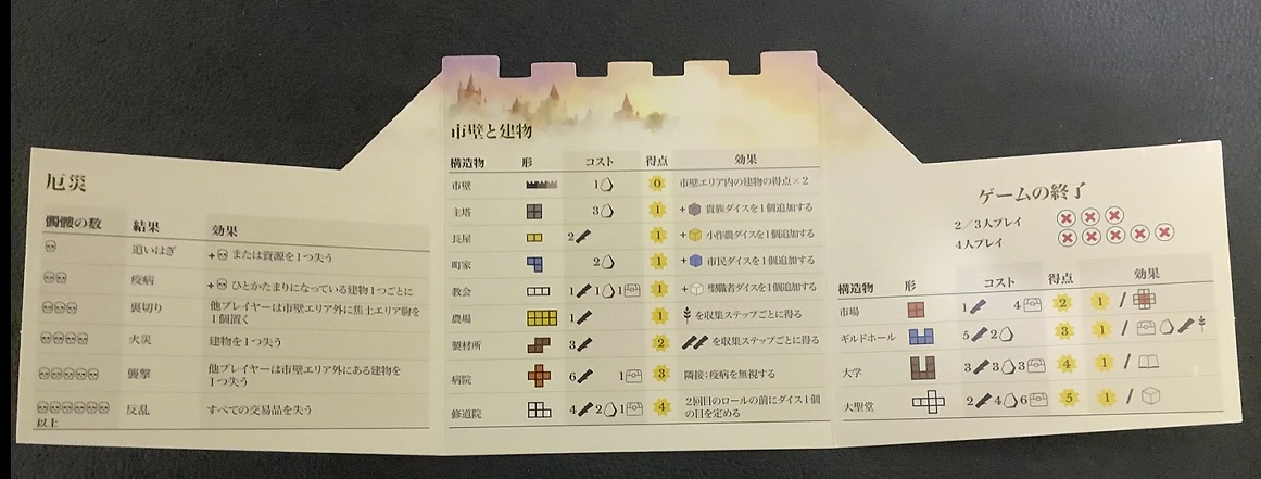 建てる建物によってダイスが様々な種類のダイスが振れるようになったり、資源を生産したり、特殊な効果をもたらしたりする建物とかあったりします。