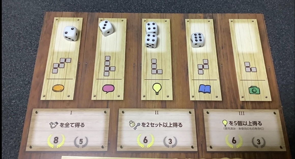 ちなみにソロの場合スコアアッタクで、ダイス3個を使いますがダイス配置が若干異なります。こちらも説明書の方を参考にしてください。