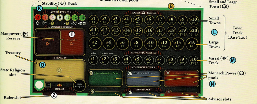 4) シナリオに別段の指示がない場合、各プレイヤーは各君主権力プール(N)に3 つの(君主権力 (キューブ))を置き、彼らの宝物庫(O)に15 のダカットを置きます。