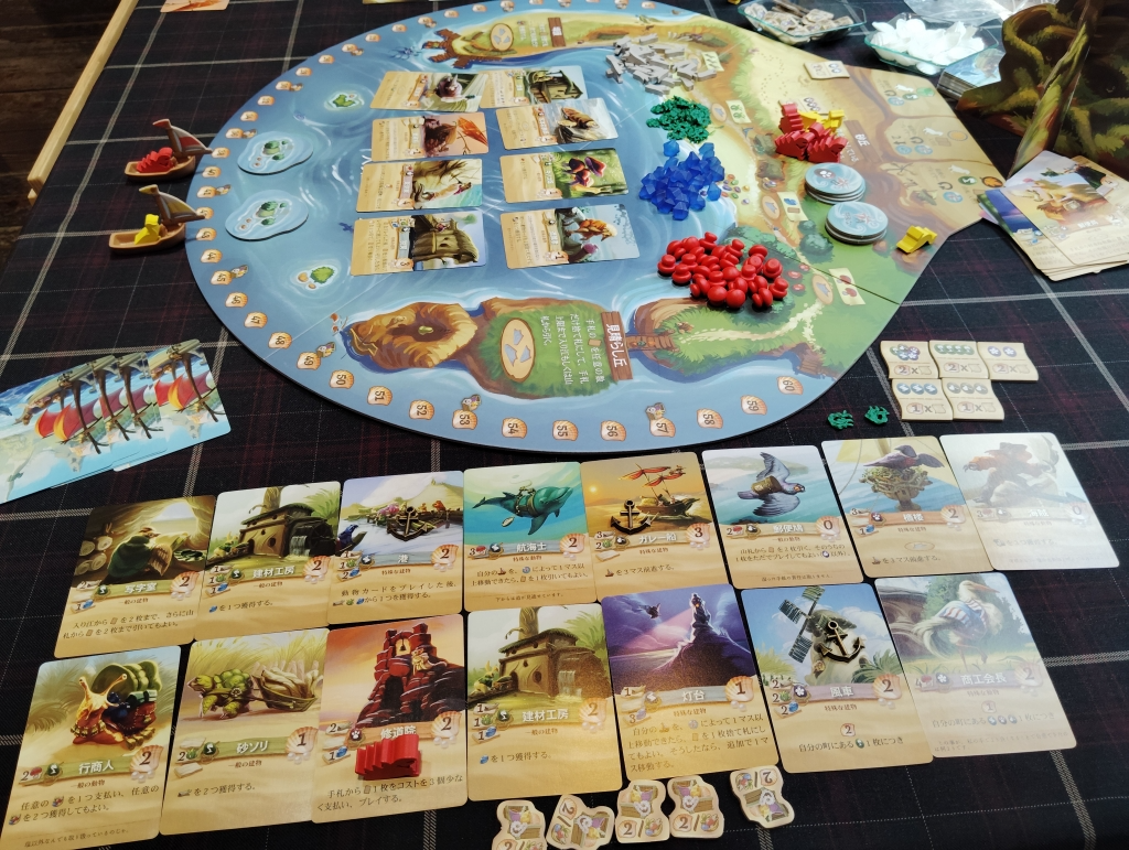ゲームの流れはエバーデールなので、遊んだことがある方は船要素と錨トークンによる建物&動物コンボとかが分かれば難しい要素はないです。
