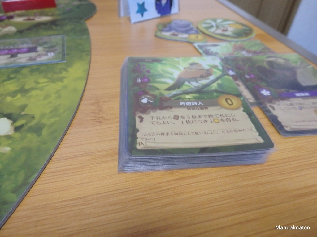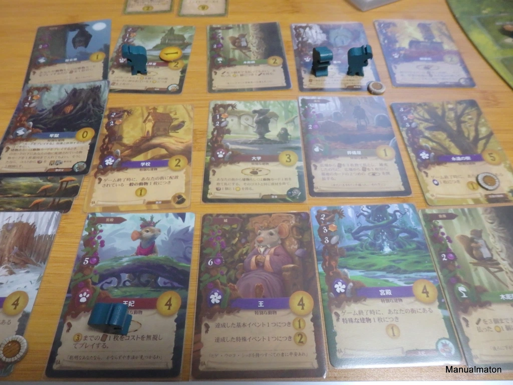 この、「カードをプレイするだけならワーカーを用いない」というシステムがゲームの肝。それに加え「特定の動物は、それに呼応する建物があれば1回だけノーコストで場に配置できる」ルールと