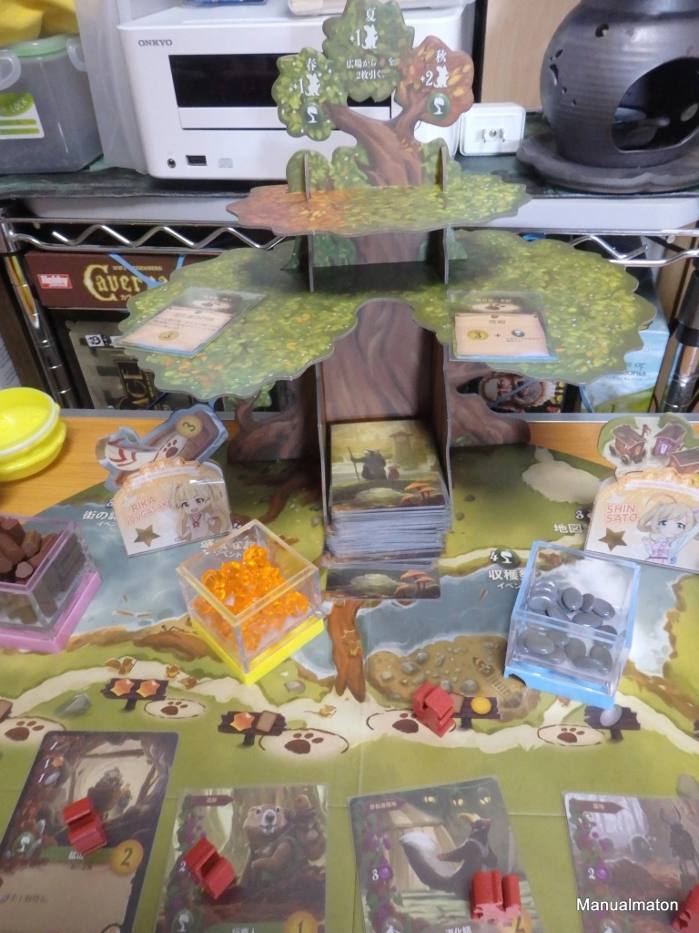 ひときわ目立つ立体的なボードと、カードが次々に連鎖していくコンボが楽しいワーカープレースメントでした。