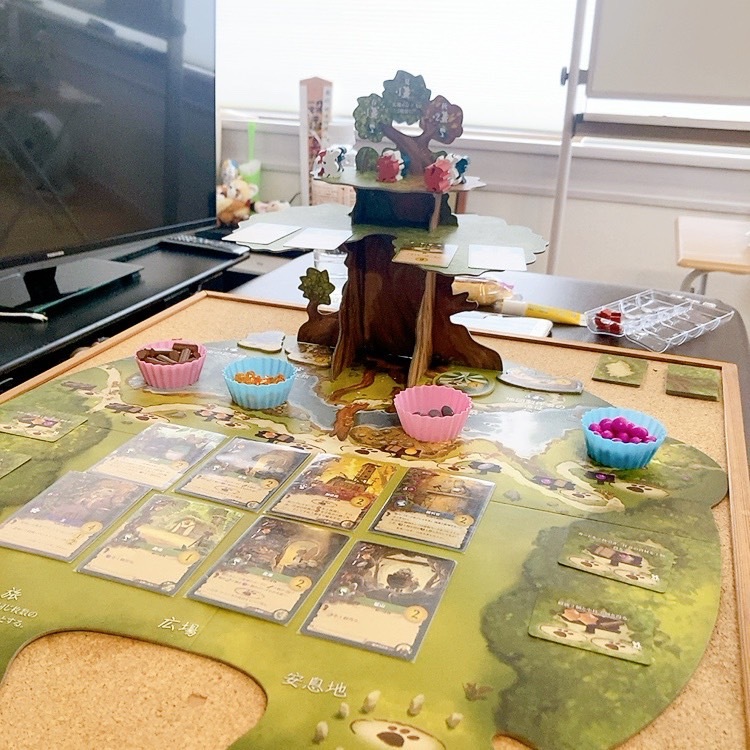プレイヤーはそれぞれ可愛い動物のコマ(資源を手に入れるコマで限られた個数持つ)を使いながら木の実や木材の資材を集め、それぞれ建物カードや動物カードを自分の街に配置していきます