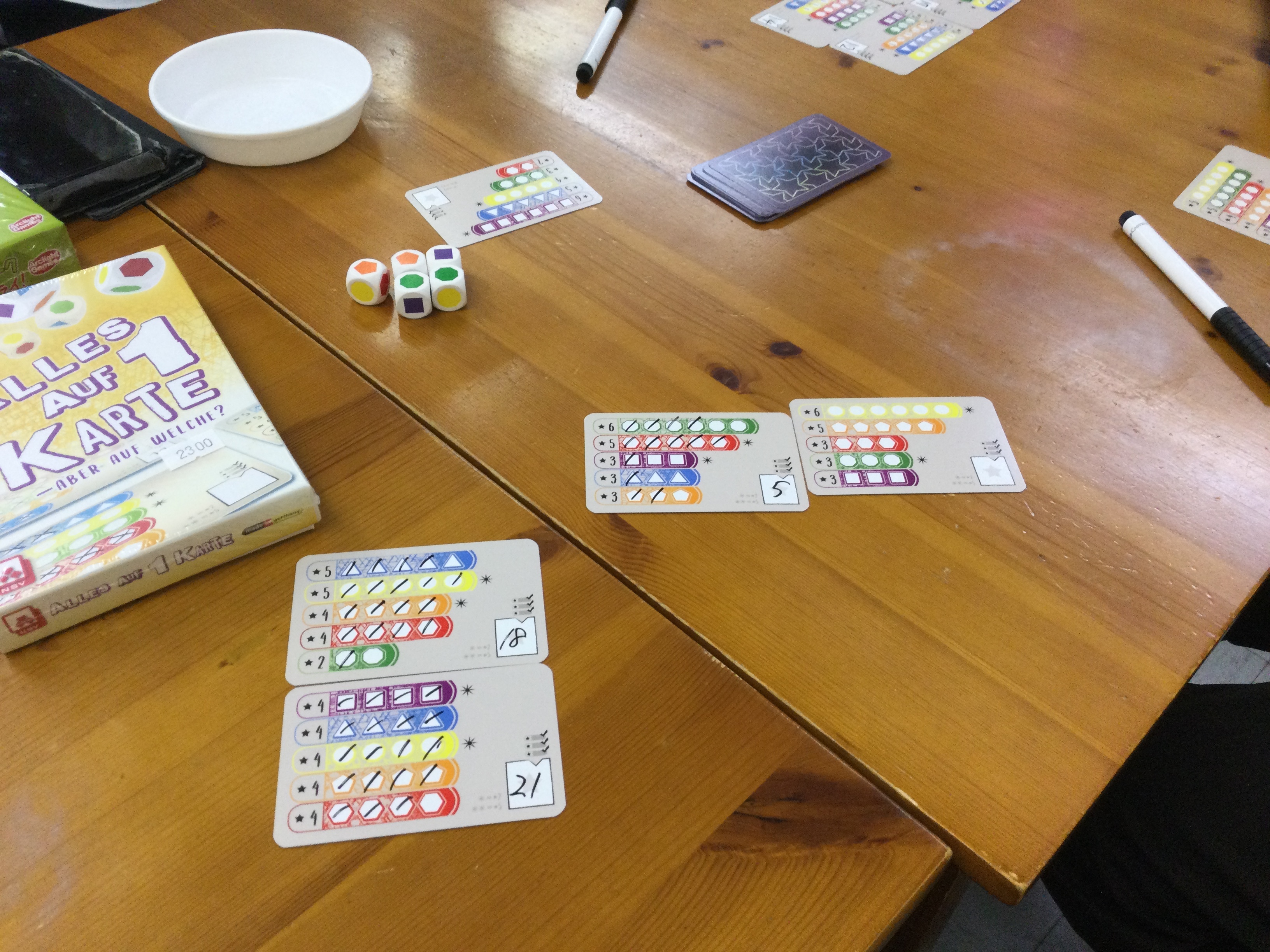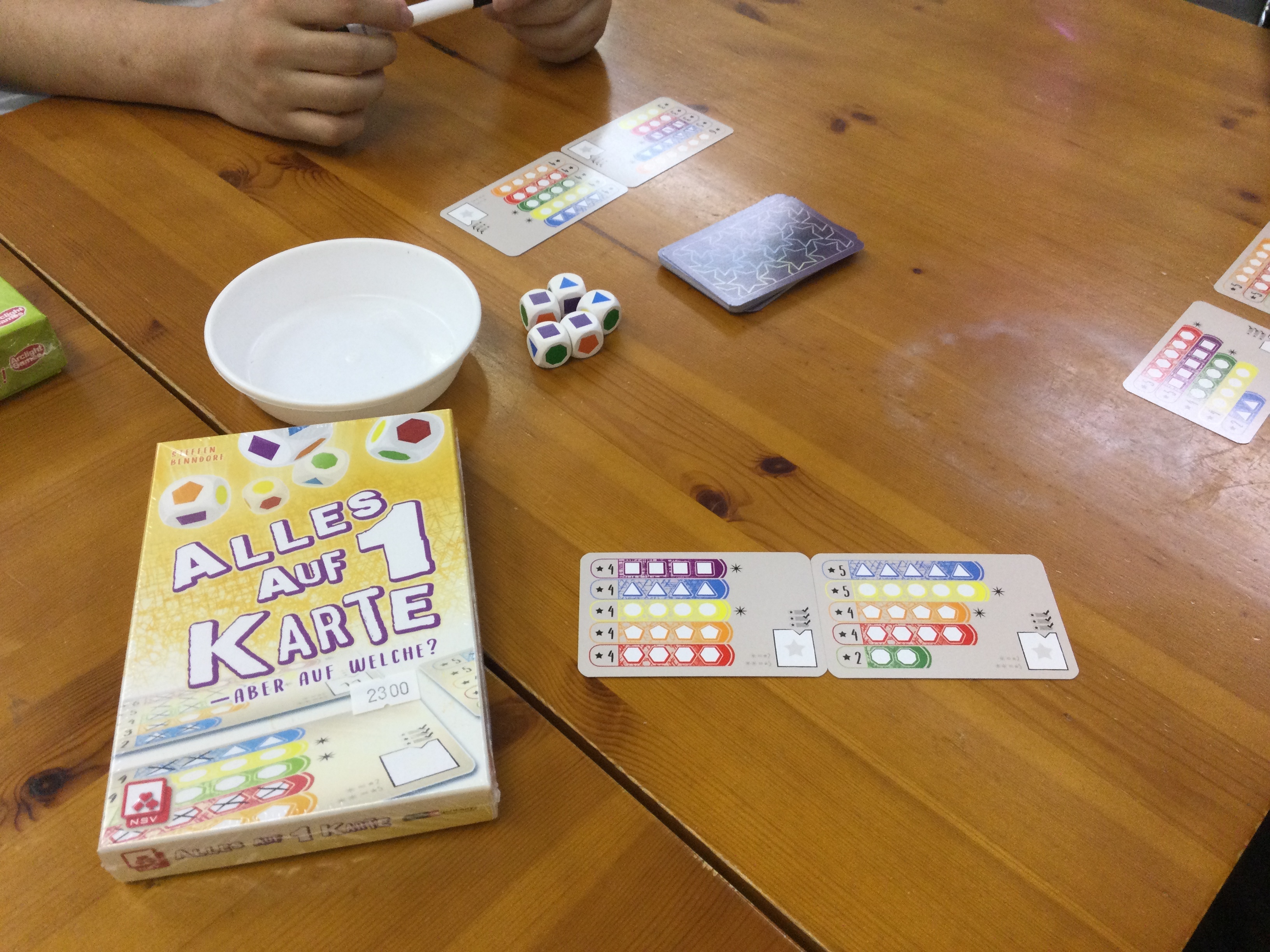 確定した目をカードに書きこんでいくのだが、この時、ゲームタイトルにもあるように「どちらか1枚のカードだけ」にしか書き込めない。また、マスを埋める時も「ダイスの数は残りマス数以下」でないといけない。