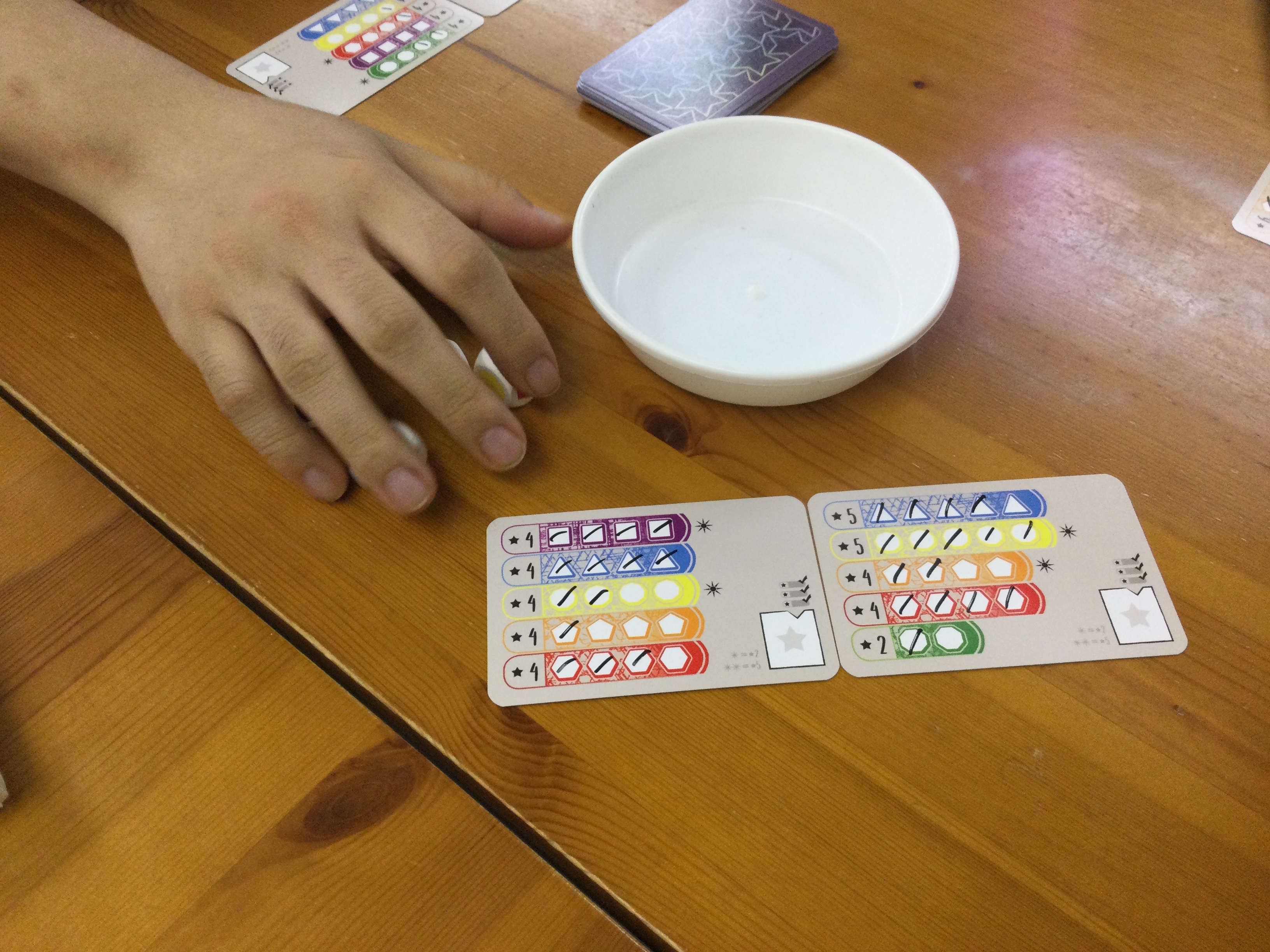ダイスは全プレイヤーが共通で参照にするので、他プレイヤーの状況も確認しなければいけないのだが、残りマス数を数えるだけでいいので簡単だ。で、1行すべてを埋めきったら、マスの数だけ得点になる。太陽のマークが付いてたら、さらに得点が上がる。