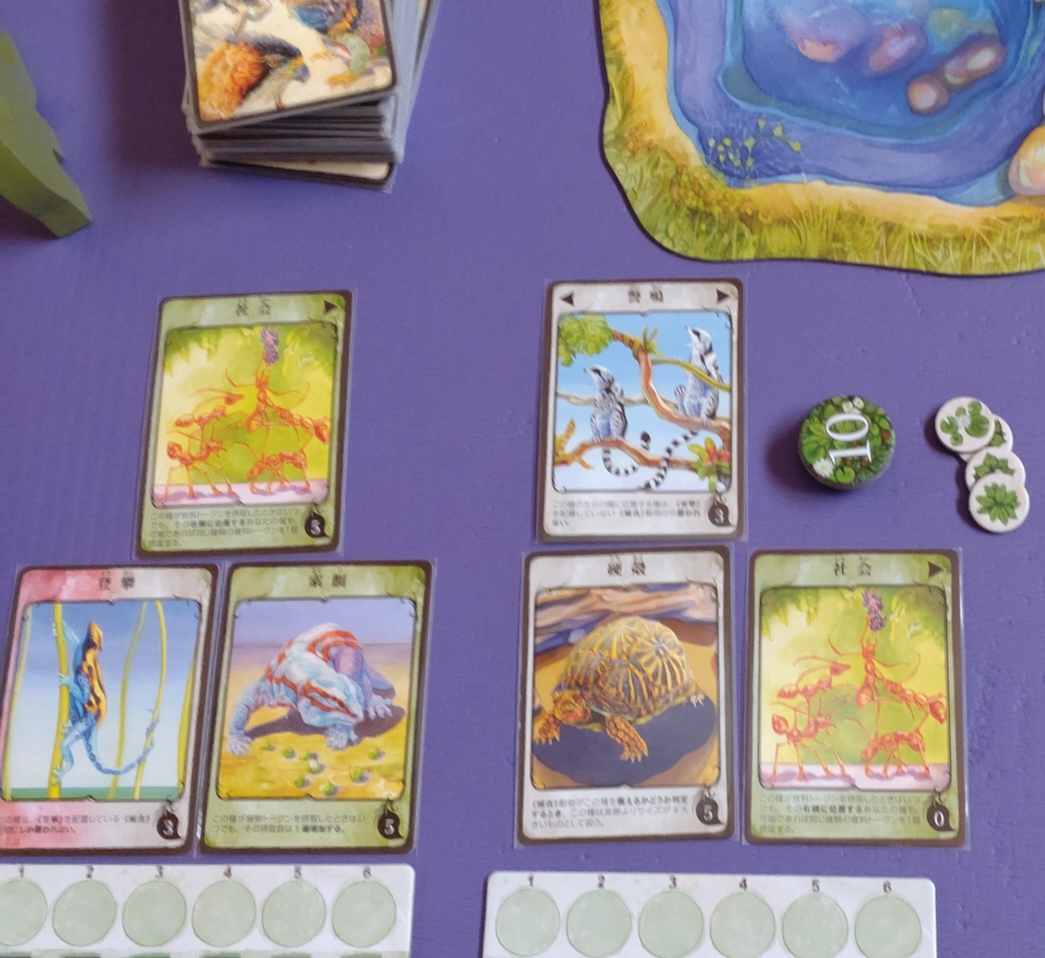 さて得点方法ですが、生物に付与してある「特徴カード」や個体数も点数になりますが、獲得する点数の大きな部分を占めるのは「食料トークン」の数です。「食料トークン」を獲得するには個体数を増やすか、捕食者となって体サイズが大きい種を襲うしか方法がありません(個体数以上に食料トークンを獲得できる)。そのため、個体数を増やすことに専念したくなります。