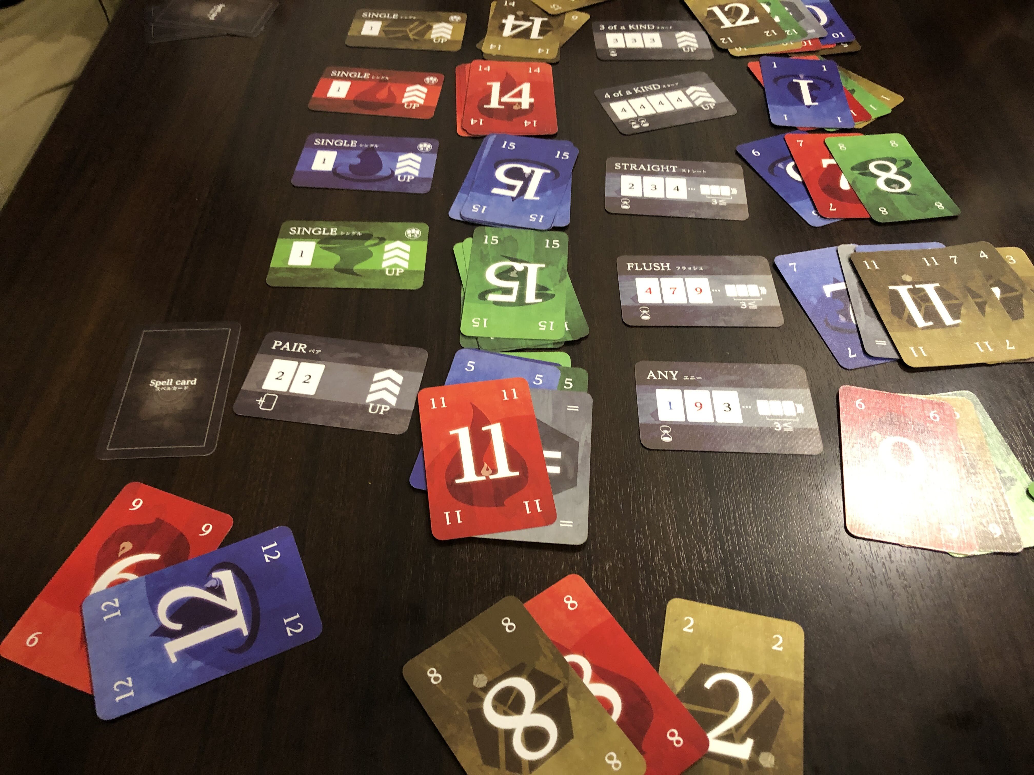 高円寺の .@lf_littlecave さんの体験会でのイグゾースト.5人まで遊べて,一人の脱落者が決まれば終了.初回で脱落者に 手持ちの札をポーカーのような要領で、いくつかある条件にあわせて順番に置きます.特定の条件でパスができるカードを取得.手持ちの札を切れなくなれば脱落 スリリングなゲームでした