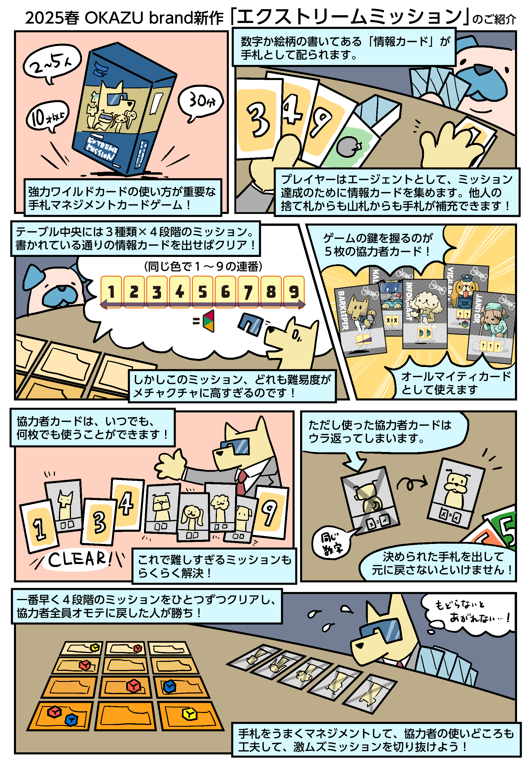 このゲームは、任務を受けたエージェントとなり、超強力な協力者(=オールマイティカード)の手を借りつつ、実現不可能なほど難易度の高いミッションのクリアを他のプレイヤーより早く目指す対戦型カードゲームです。
