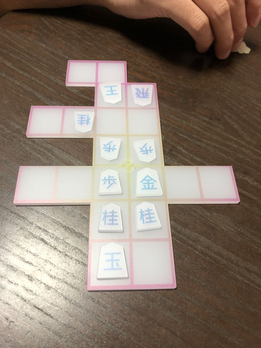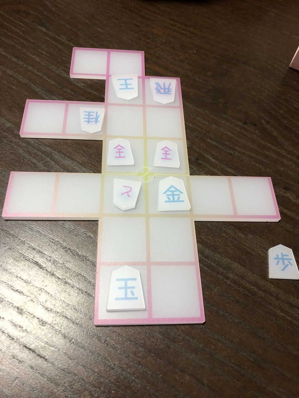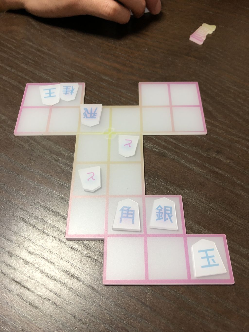 この時点で、左側の角が割としんどい。多分将棋強い人であれば、この時点で詰将棋的に勝ち負けわかってるんですかね。ちなみに私(手前)が後攻です。