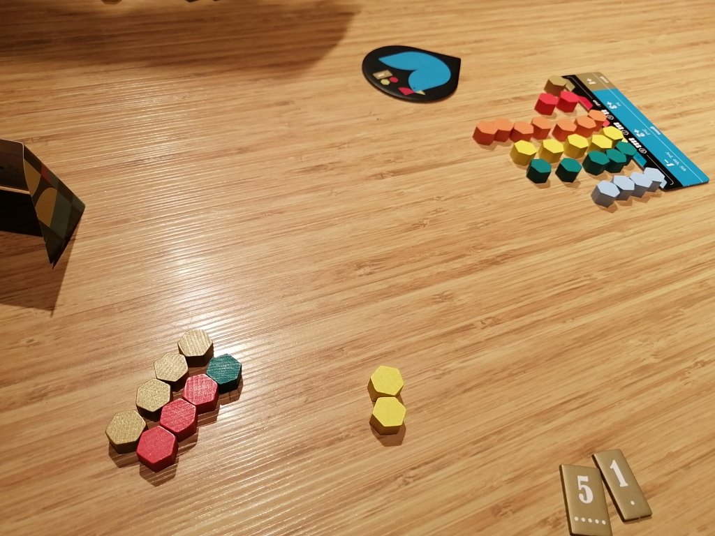 6色の駒を使った競りゲームで、金は20個、残り5色は各12個あります。テーマが鶏の卵を世話する競りなので、自分の卵は価値を高めなくてはいけません。