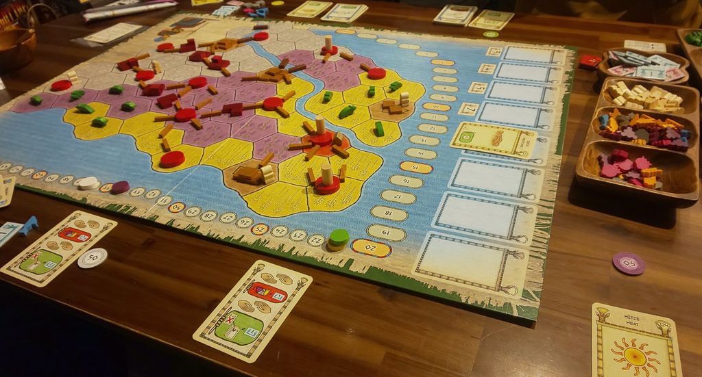 序盤は手探り感が強いですが、徐々に強いカードがオープンされていき、目標が分かりやすくなります。終盤はさらに強いカードの取り合いで、大量得点できるのは快感です。しかし終了フラグが切られると手札の回復ができなくなるので、そこには気を付ける必要があります。
