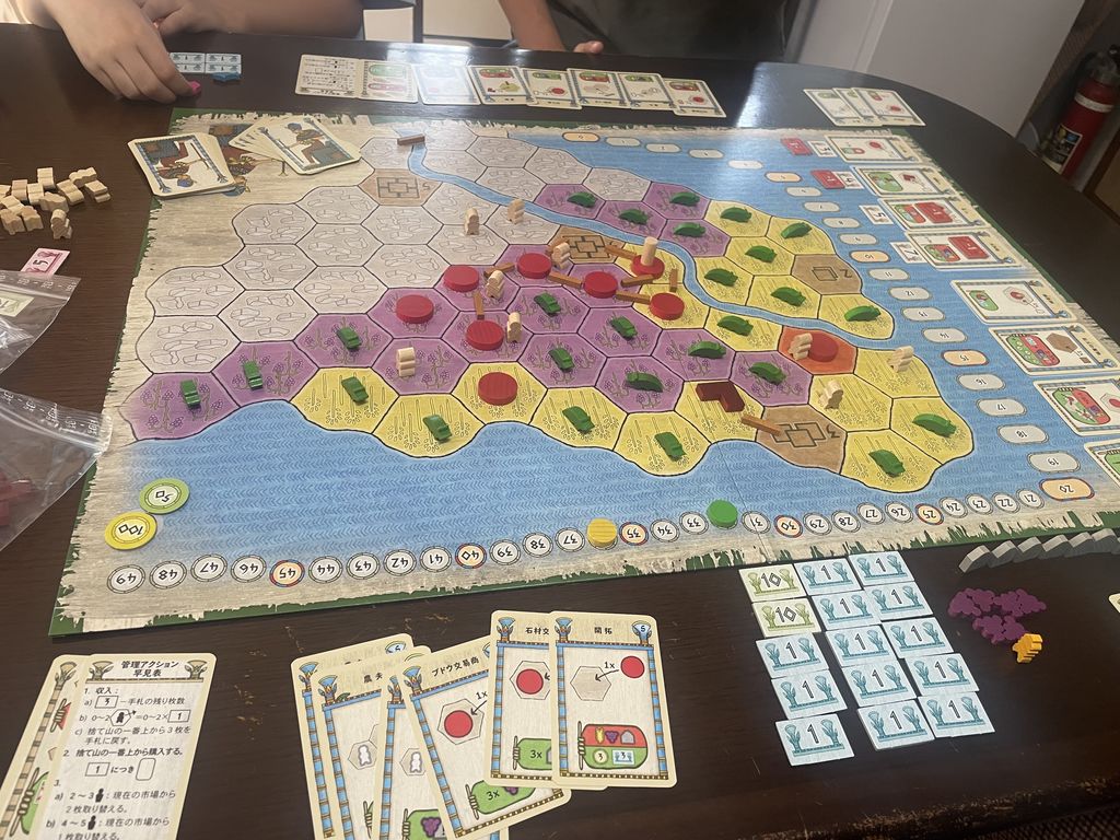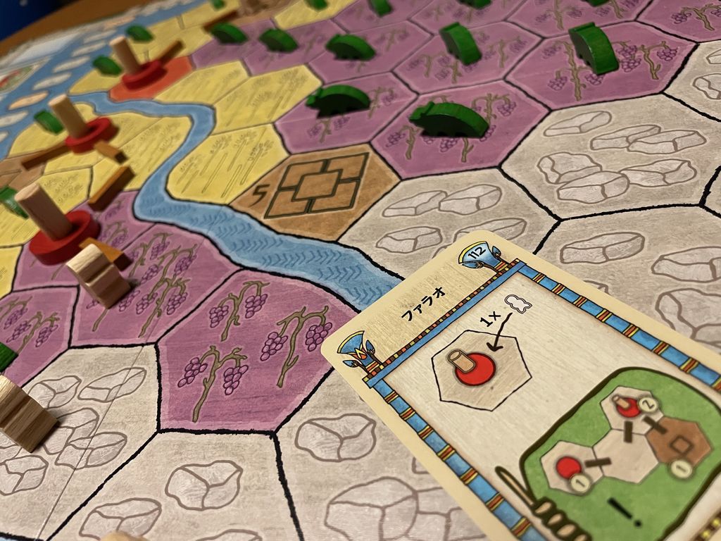 後日、ルール間違えが無ければどうなっていたのか一人で回してみたのですが。薔薇が重要になるのは相変わらず、最終盤は〝ファラオ〟対〝宮殿〟の対決に。1点差の決着でした。終盤戦のダウンタイムも実に重厚な時間でして、逆にこれはとても楽しいんじゃないの?