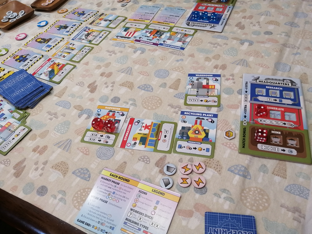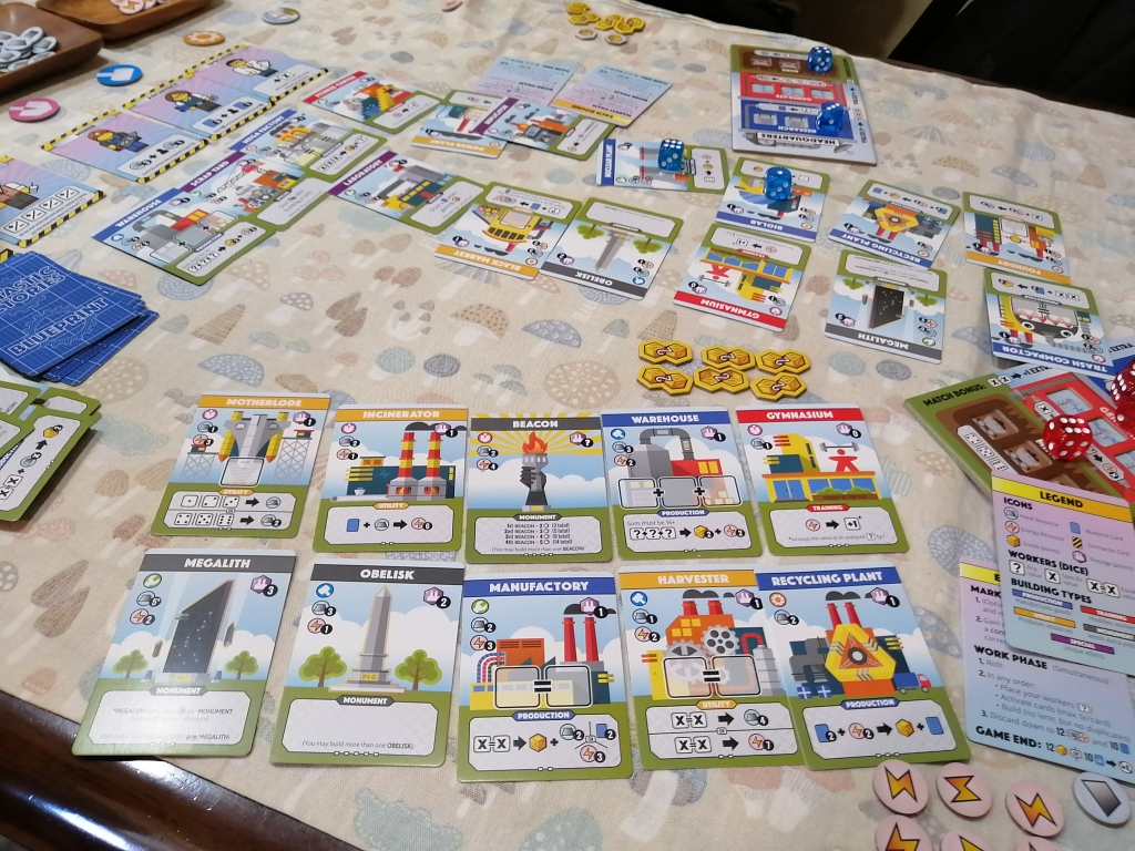 コストを支払い建物を建設して、建物の効果を使って資材や得点を獲得したりする。