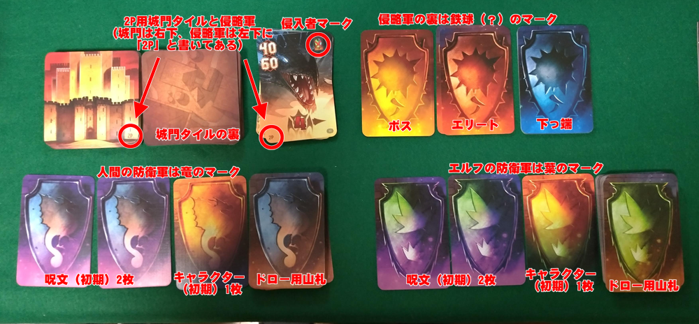 - 侵略軍、人間の防衛軍、エルフの防衛軍のカードの見分け方は裏面の盾マーク。侵略軍は鉄球(?)、人間は竜、エルフは葉のマーク。色で侵略軍のボス・エリート・下っ端、防衛軍の呪文・キャラクター・その他を判別できる(一部見分けづらいが……)。