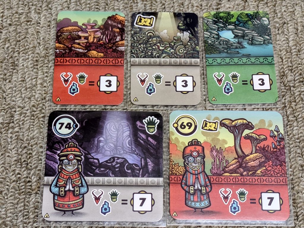 特に新しく追加された灰色を参照するカードは、必要な資源がかなり多いのでうまくやらないと自滅しますが、ハマれば高得点が期待できます。息子はすぐ順応して、さっそく得意の戦略として習得してしまい、1枚で25~30点を叩きだします。あいつに「73」と「76」は渡してはいけない・・。