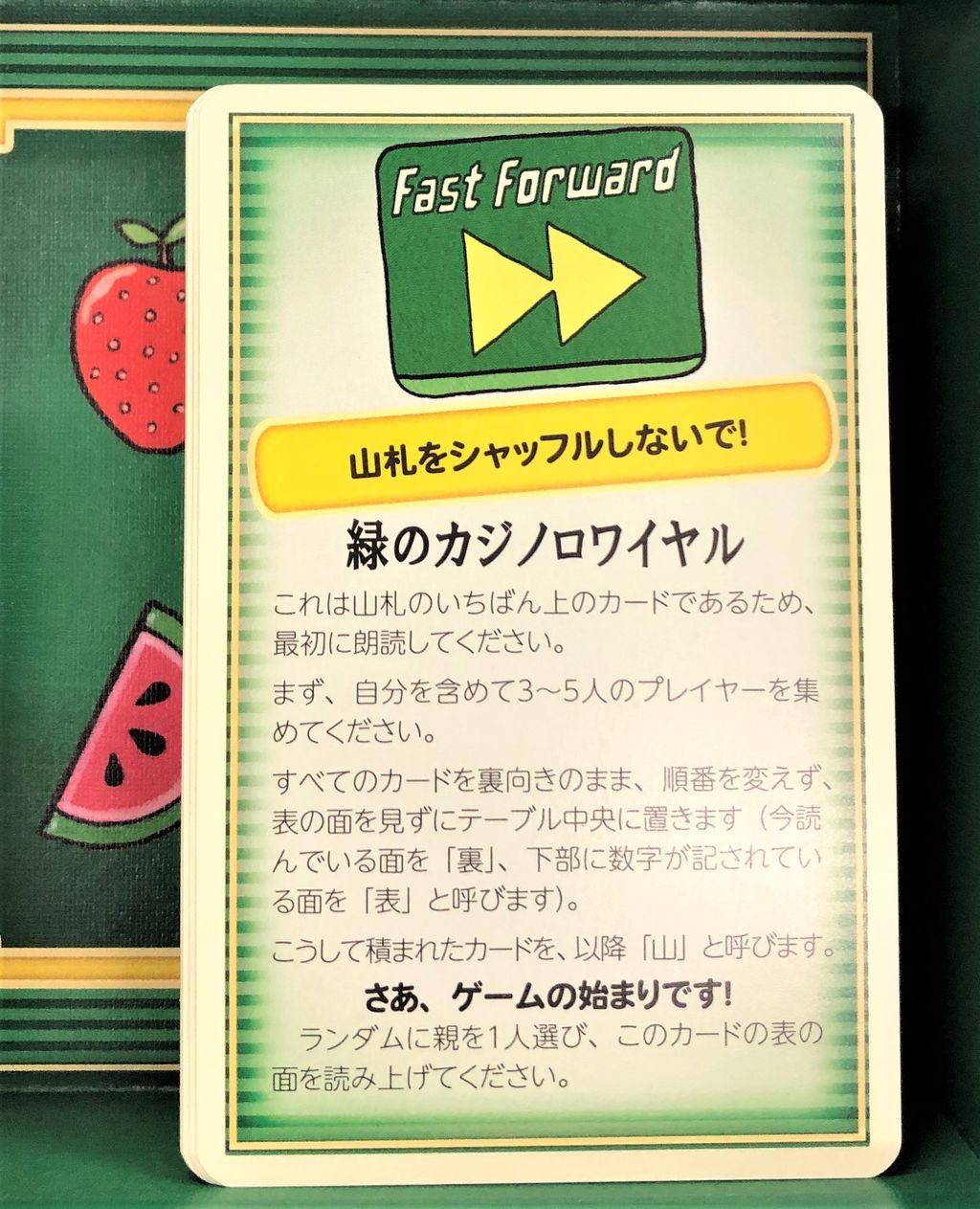ファストフォワードシリーズは、ルールが入っていなくて、遊ぶうちにルールがちょっとずつ追加されていく!全員未プレイでもすぐに遊べる!がコンセプトです。