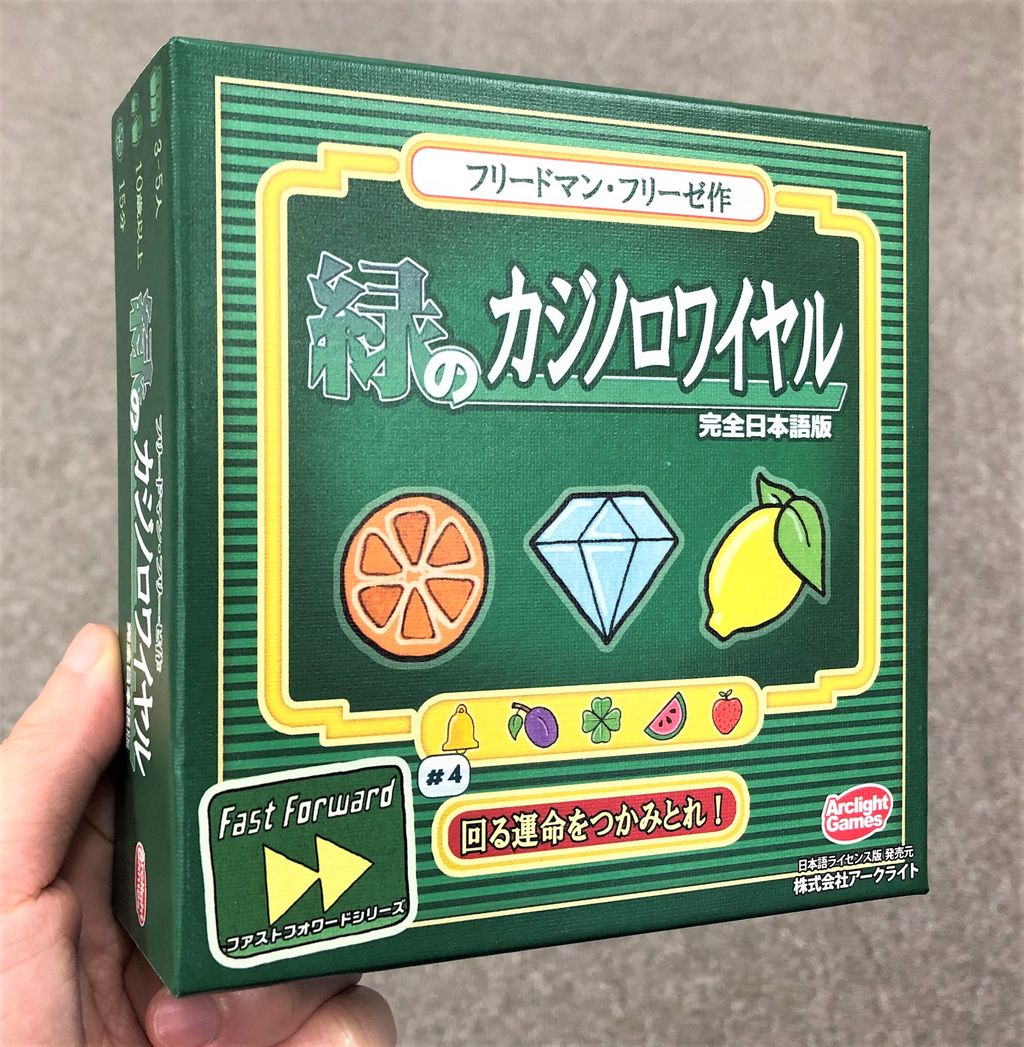 緑のカジノロワイヤルは、めちゃくちゃ簡単な麻雀、といった感じで、数字の大きさを競うとはいえ基本的に素点では勝てず、何かしらの効果を狙うことになります。最大人数でやったからか、思って以上に手番が回ってくる前に終わるので、終了までに何回くらいカードを引けるかの意識が大事だなと思いました!