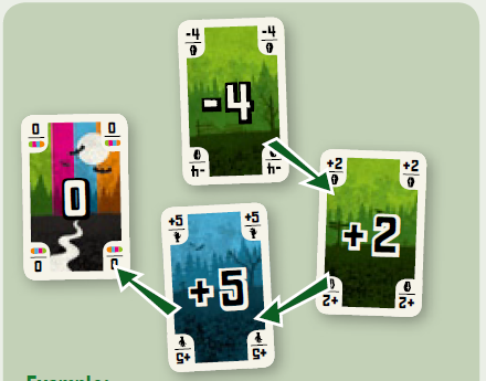 60枚のカードには、青、オレンジ、マゼンタ、緑の4色が含まれ、「+6」から「+1」と「-1」から「-6」の値を持っています。各色に「+1」と「-1」がそれぞれ2枚ずつ(他の値は1枚ずつ)入っており、さらに、値「0」の4色カードが4枚入っています。