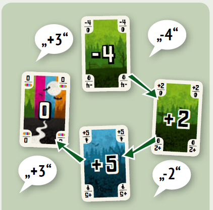 例: アンジェリカは緑の「-4」でトリックを開始し、「-4」を宣言します。サビーヌは緑の「+2」でリードスートをフォローし、「-2」を宣言します。ヘドウィグはそれをフォローできず、青の「+5」で降りて、「+3」を宣言します。ニコールは手札に緑カードを持っていますが、どれもプレイしたくありません。代わりに、彼女は「0」でリードスートをフォローし、「+3」を宣言します。 |
