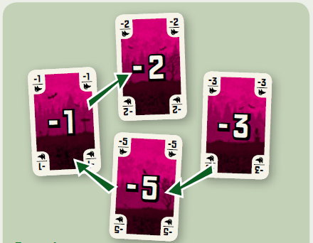 例: 1) ラウンド終了時にアンジェリカの紫色のゴーストがスペース「+8」に立ち、サビーヌの白いゴーストがスペース「-2」に、ヘドウィグの緑色のゴーストがスペース「+5」に、ニコールの黄色のゴーストがスペース「-11」に立っています。 2) したがって、彼らは次のように恐怖ポイントをメモします: アンジェリカは8、サビーヌは2、ヘドウィグは5、ニコールは11の恐怖ポイントに苦しんでいます。 |