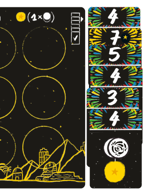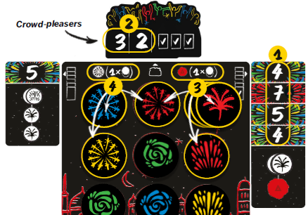 例: 1) 達成した目標:20ポイント (4+7+5+4) 2) 観衆の歓喜:5ポイント(3 + 2) 3) 指定された色の花火タイル:5ポイント(1+1+3) 4) 指定された種類の花火タイル:3ポイント(1+1+1) 合計: 33ポイント |